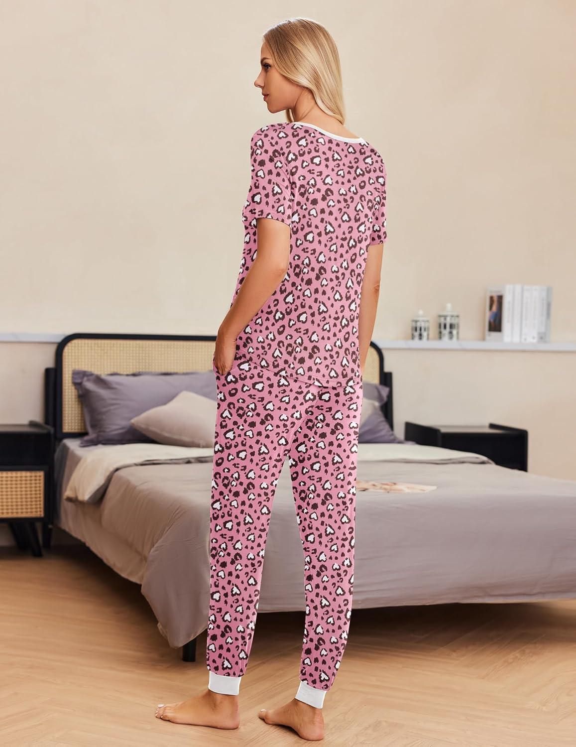 Ekouaer Pajamas for Women Set 2 Piece Lounge Set Short Sleeve Pjs Joggers Long Pants Sleepwear with Pockets(Pink Love Leopard)