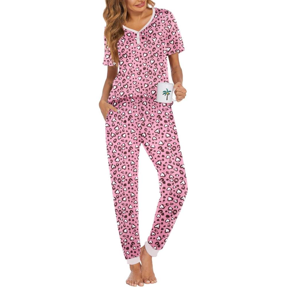 imageEkouaer Pajamas for Women Set 2 Piece Lounge Set Short Sleeve Pjs Joggers Long Pants Sleepwear with PocketsPink Love Leopard