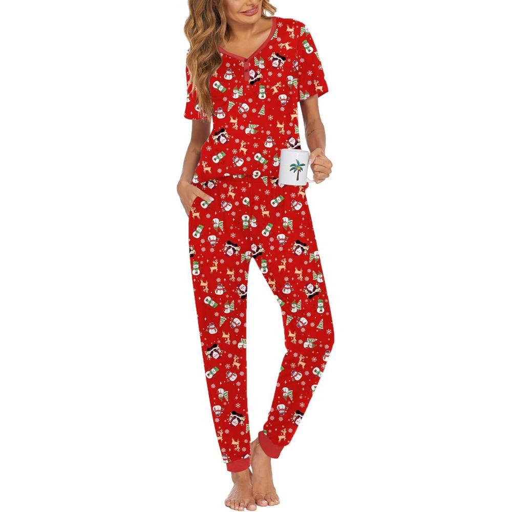 imageEkouaer Pajamas for Women Set 2 Piece Lounge Set Short Sleeve Pjs Joggers Long Pants Sleepwear with PocketsRed Christmas