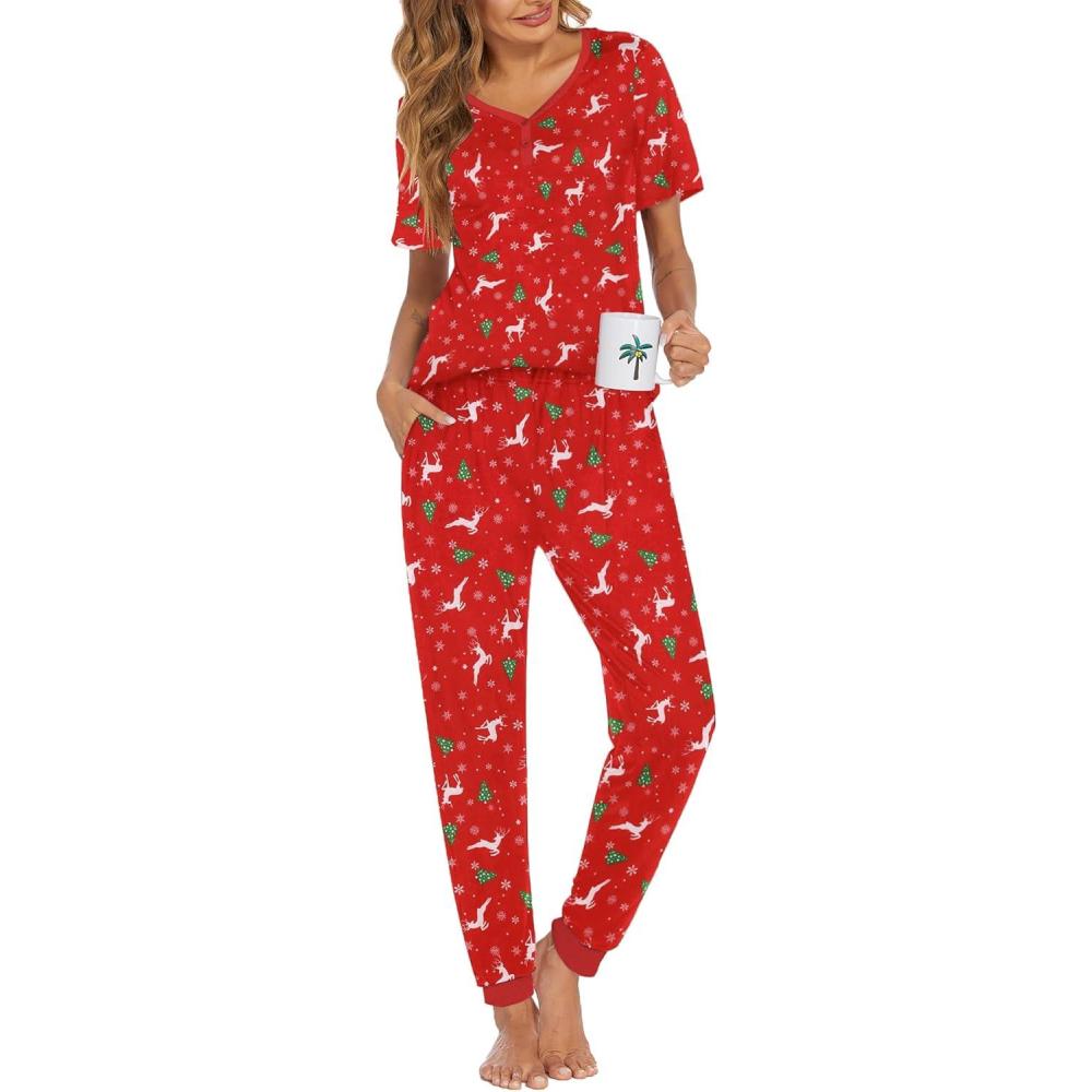 Ekouaer Pajamas for Women Set 2 Piece Lounge Set Short Sleeve Pjs Joggers Long Pants Sleepwear with Pockets(Red Deer Christmas)