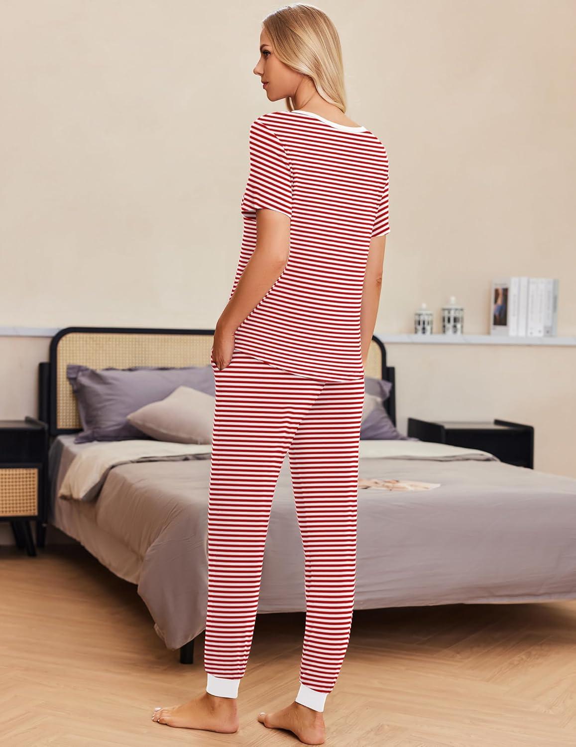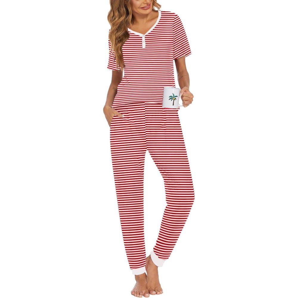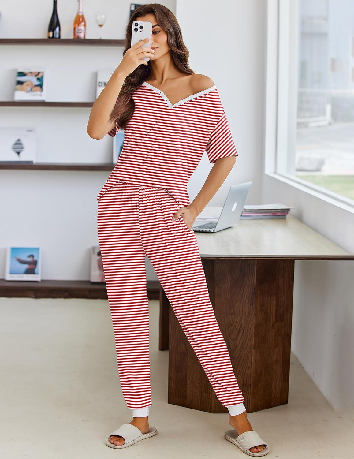 Ekouaer Pajamas for Women Set 2 Piece Lounge Set Short Sleeve Pjs Joggers Long Pants Sleepwear with Pockets(Red Stripe)