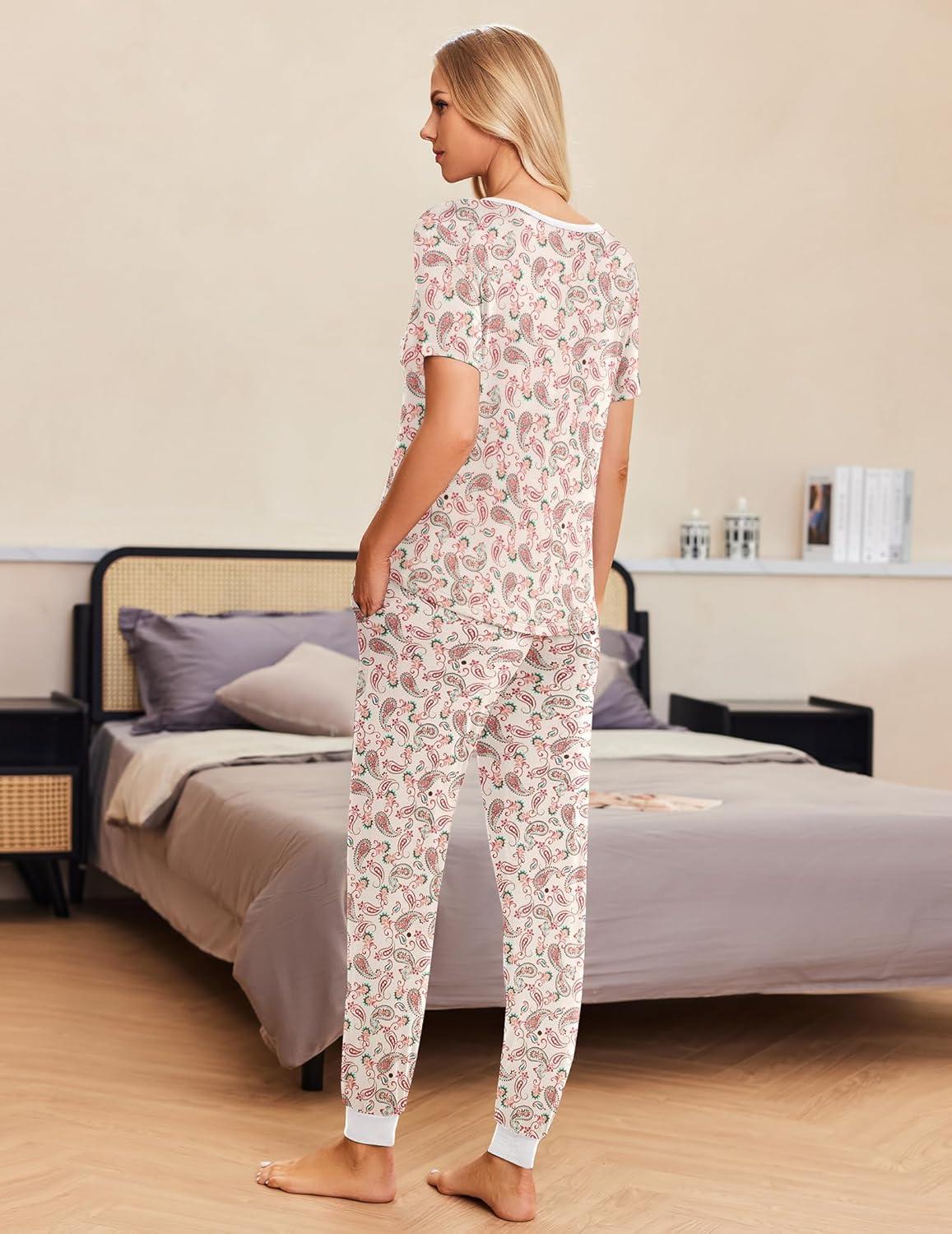 Ekouaer Pajamas for Women Set 2 Piece Lounge Set Short Sleeve Pjs Joggers Long Pants Sleepwear with Pockets(White Apricot Cashew)