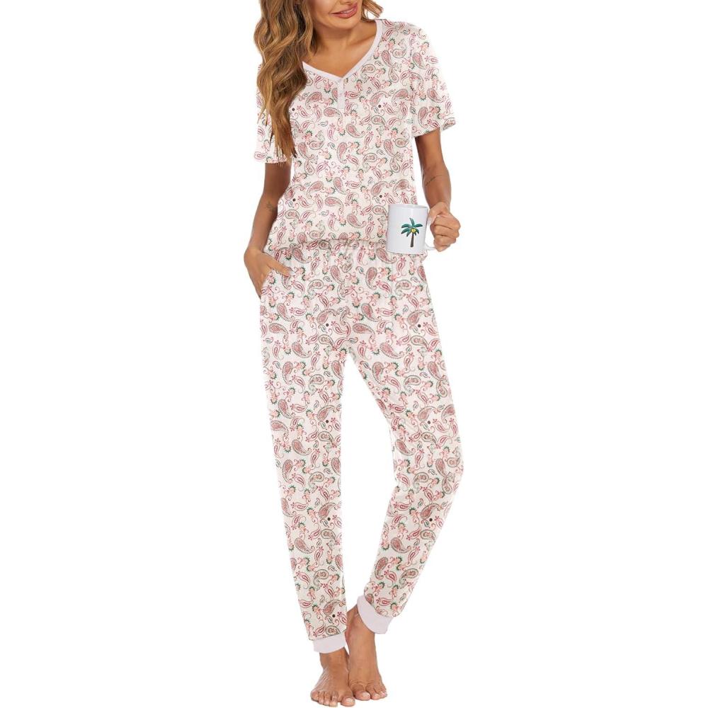 Be the first to review “Ekouaer Pajamas for Women Set 2 Piece Lounge Set Short Sleeve Pjs Joggers Long Pants Sleepwear with Pockets(White Apricot Cashew)”