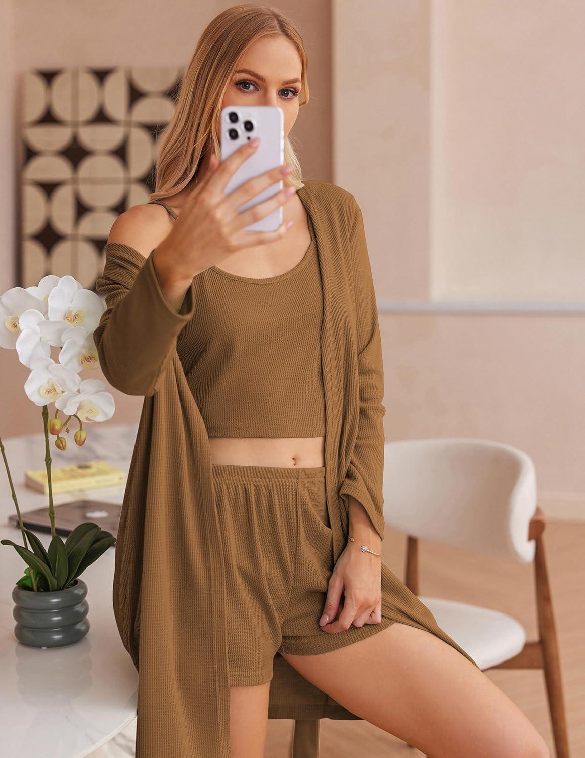 Ekouaer Pajamas for Women Set 3 Piece Lounge Set Soft Pajama Sets Waffle Knit Tank Top and Shorts Cardigan with Pockets S-XXL(Brown)