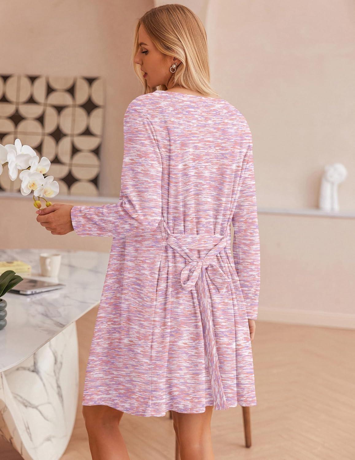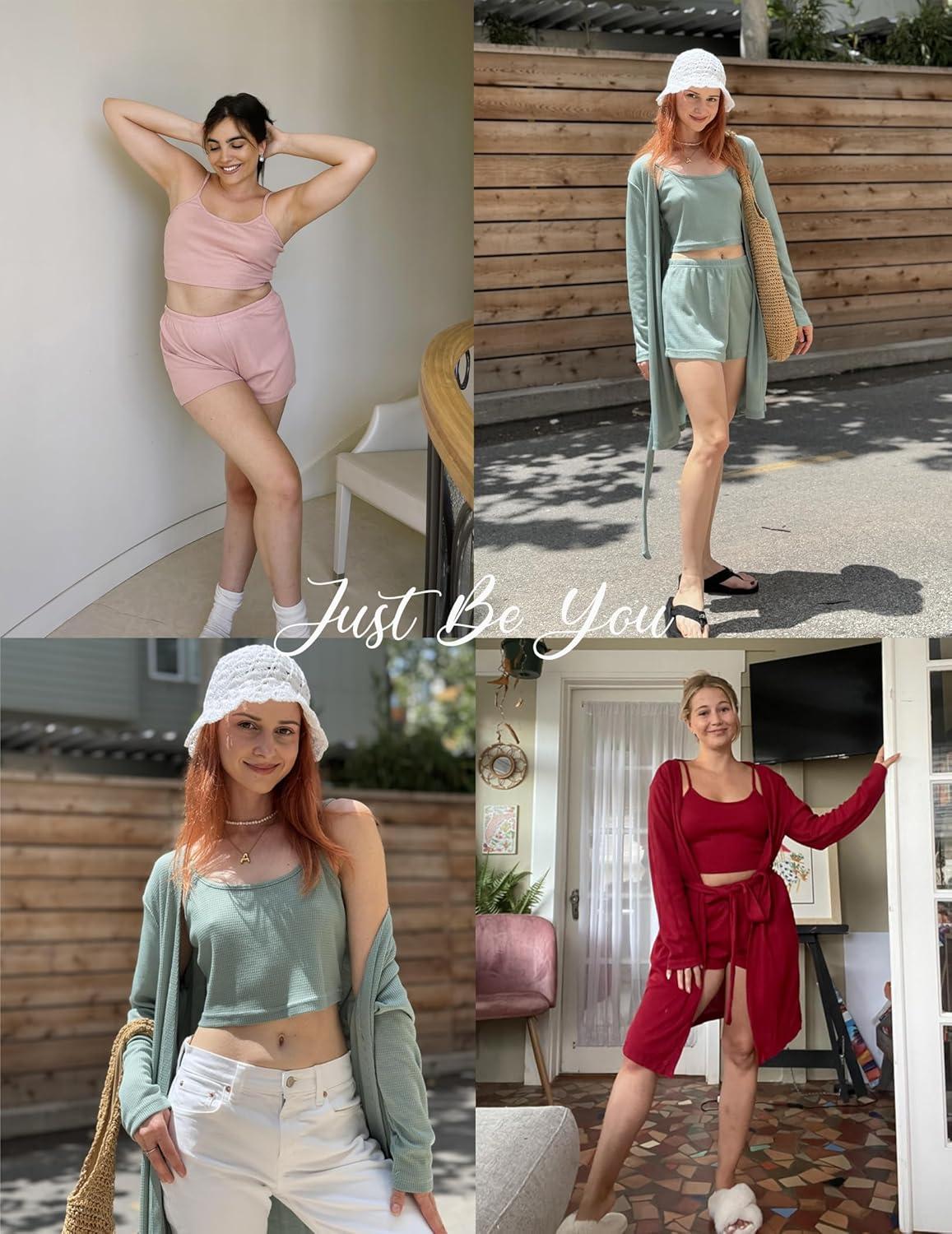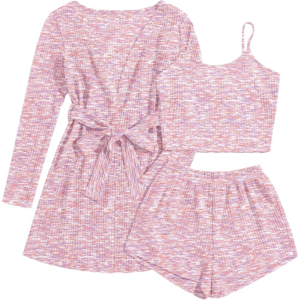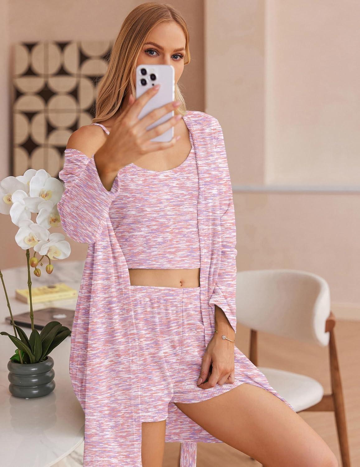 Ekouaer Pajamas for Women Set 3 Piece Lounge Set Soft Pajama Sets Waffle Knit Tank Top and Shorts Cardigan with Pockets S-XXL(Pink Tie Dye)