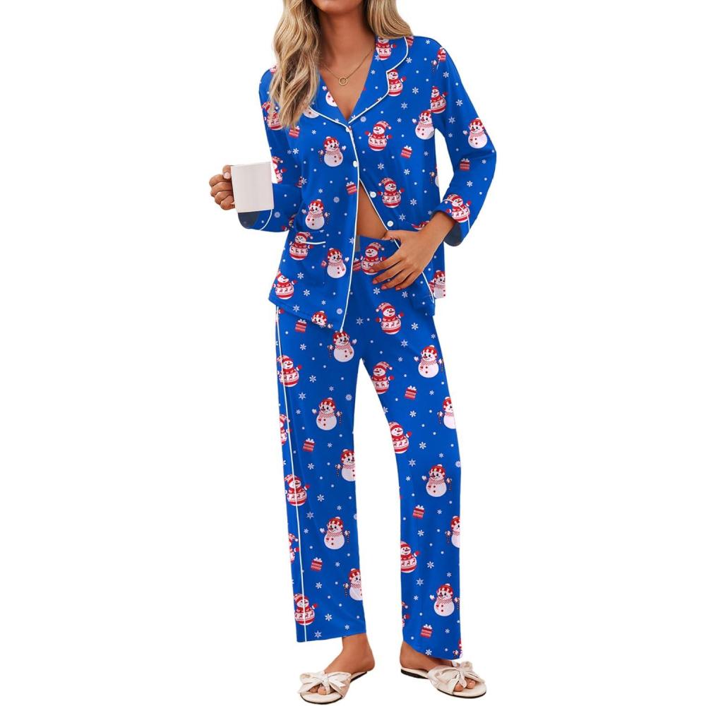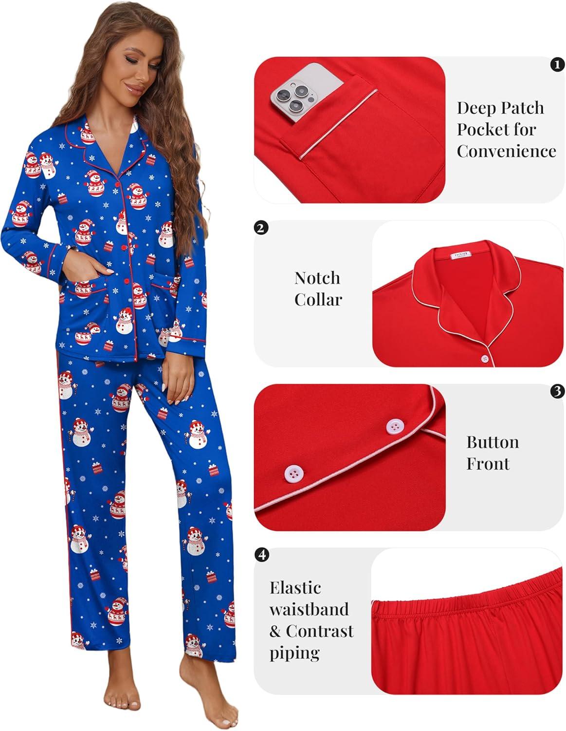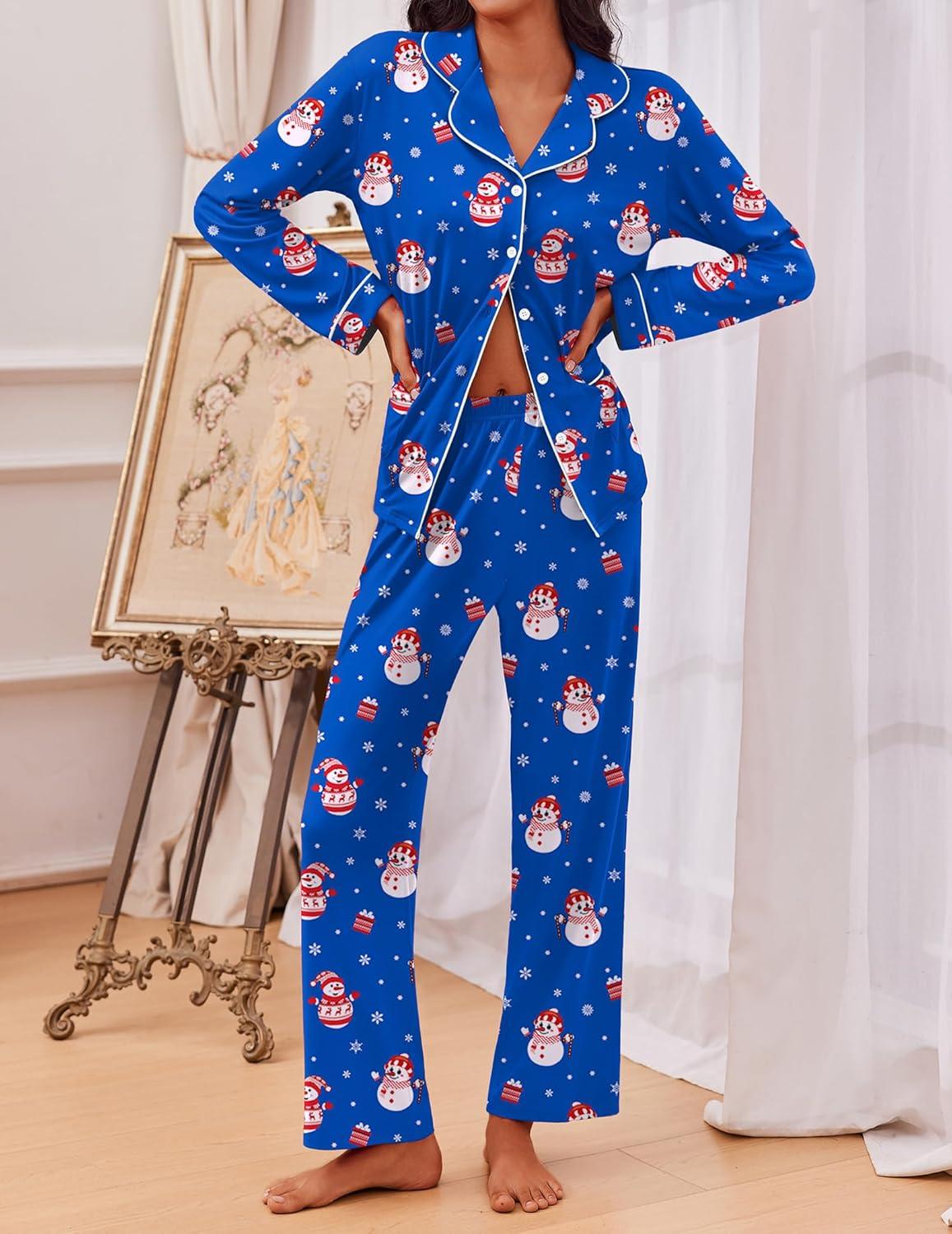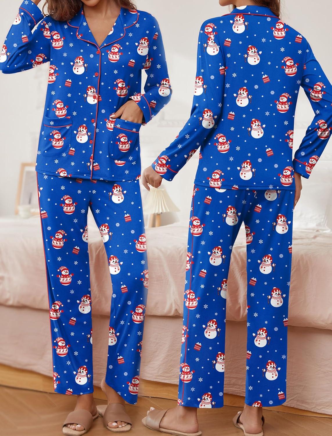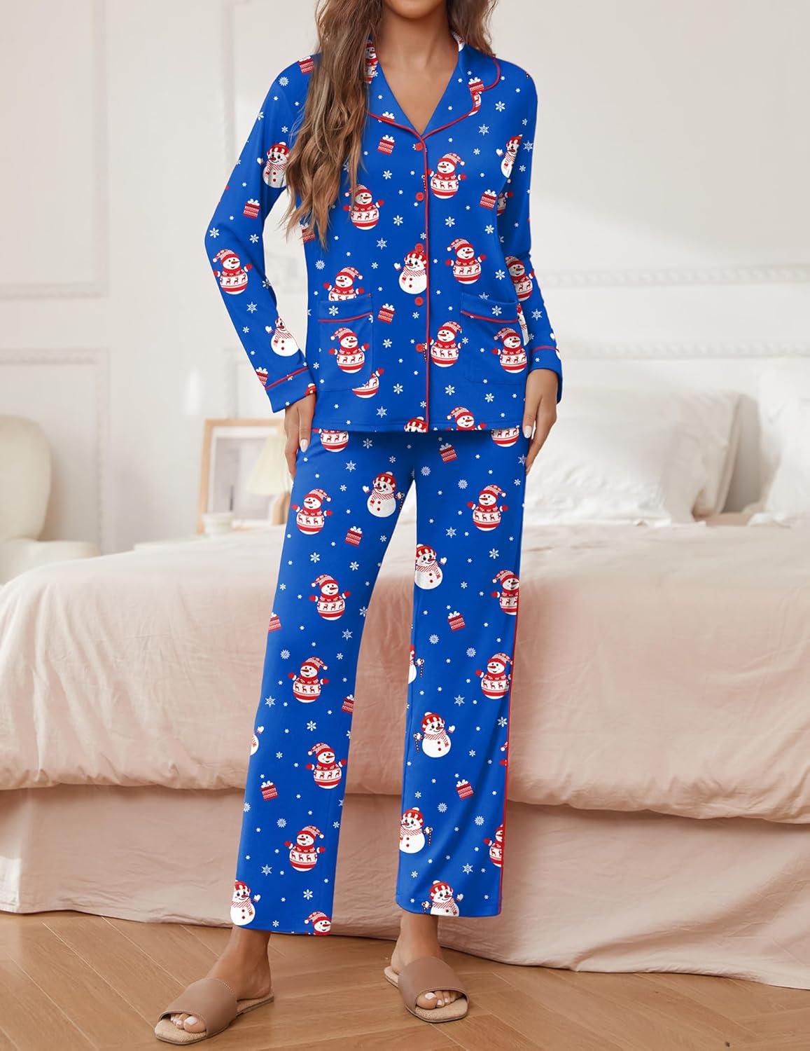 Ekouaer Pajamas for Women Set Button Down Pj Long Sleeve Shirt and Pants Lounge Sets Fall Sleepwear with Pockets(Blue Snowman)