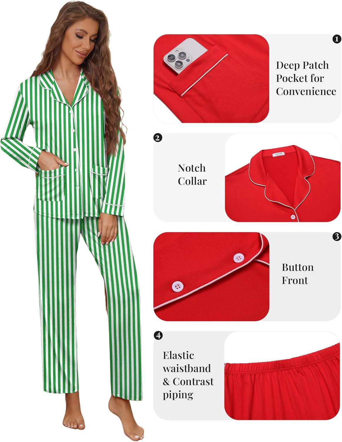 Ekouaer Pajamas for Women Set Button Down Pj Long Sleeve Shirt and Pants Lounge Sets Fall Sleepwear with Pockets(Green Striped)