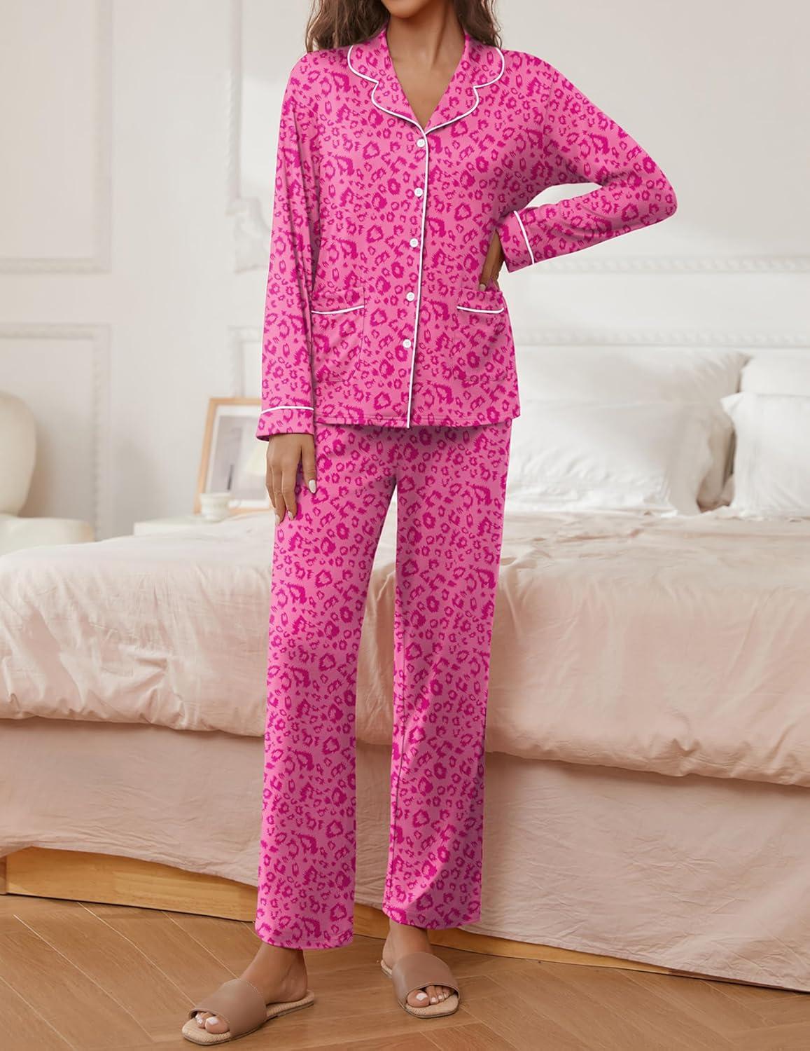 Ekouaer Pajamas for Women Set Button Down Pj Long Sleeve Shirt and Pants Lounge Sets Fall Sleepwear with Pockets(Hot Pink Leopard)
