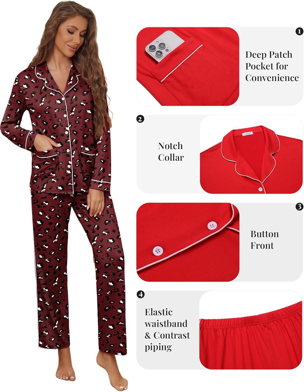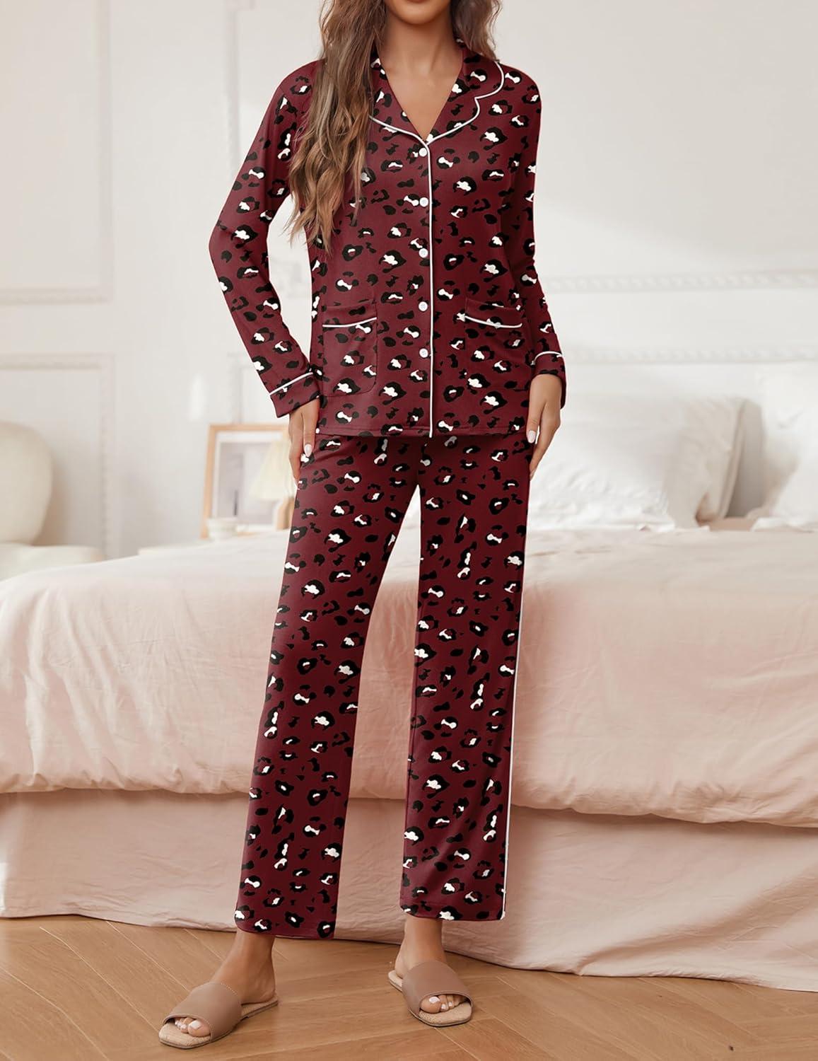 Ekouaer Pajamas for Women Set Button Down Pj Long Sleeve Shirt and Pants Lounge Sets Fall Sleepwear with Pockets(Wine Red Cheetah)