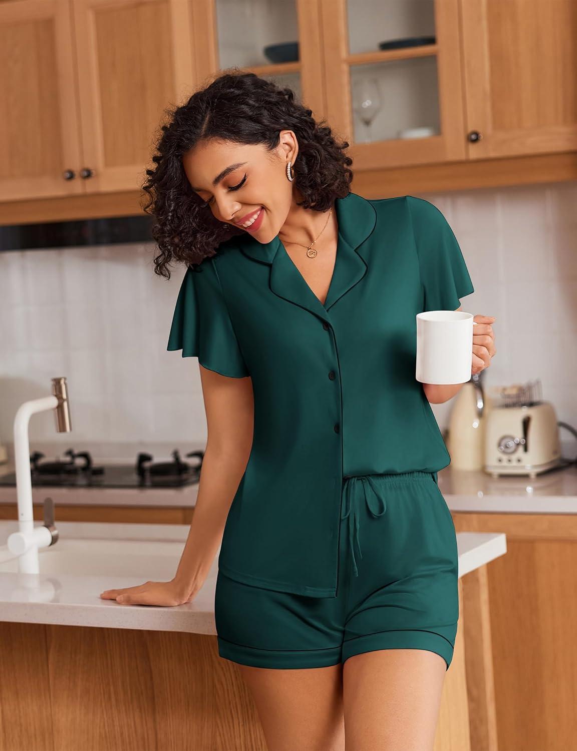 Ekouaer Pajamas for Women Set Button Up Pjs Short Sleeve Ruffle Sleepwear Notch Collar Bride Soft Pj Lounge Sets S-XXL(Green)