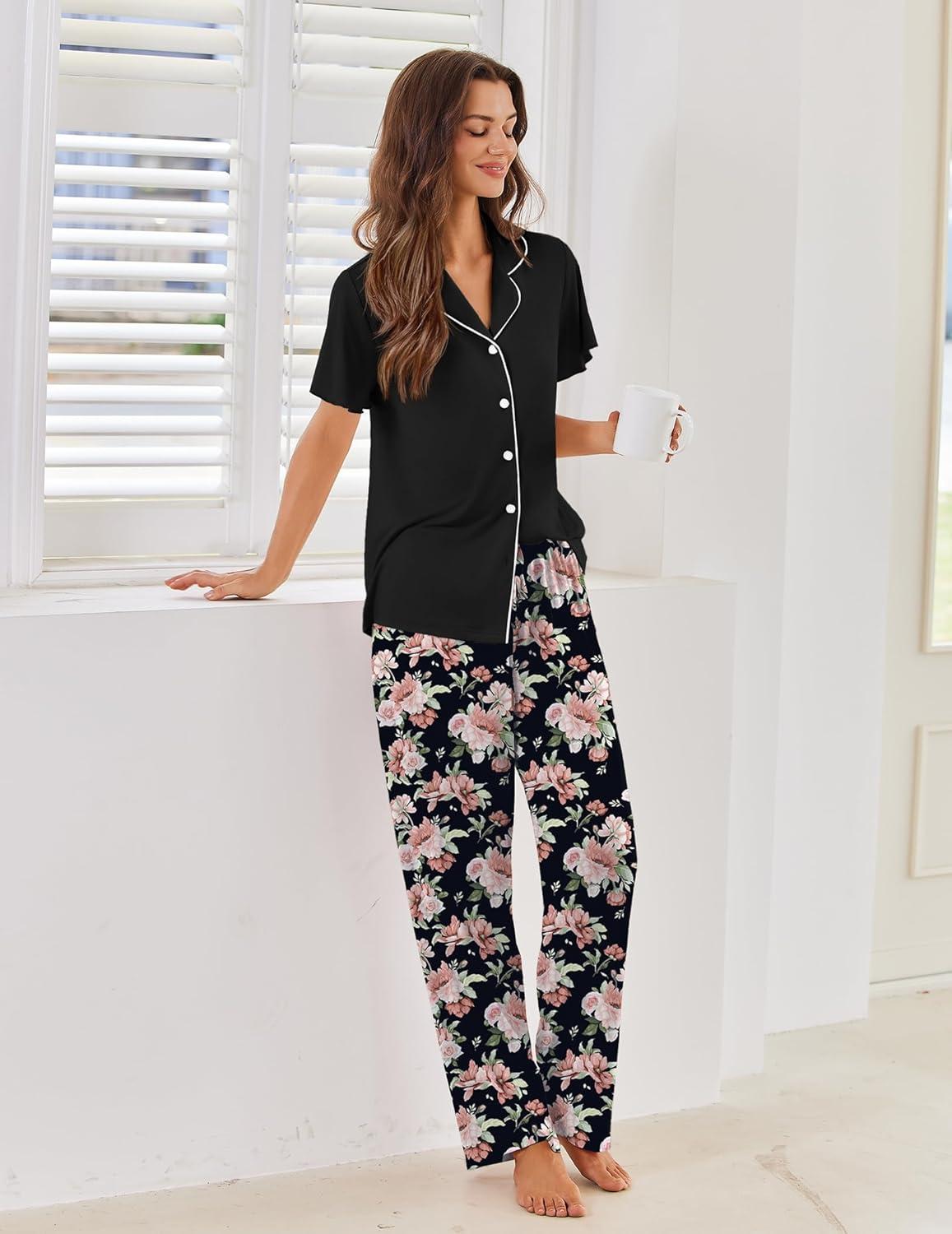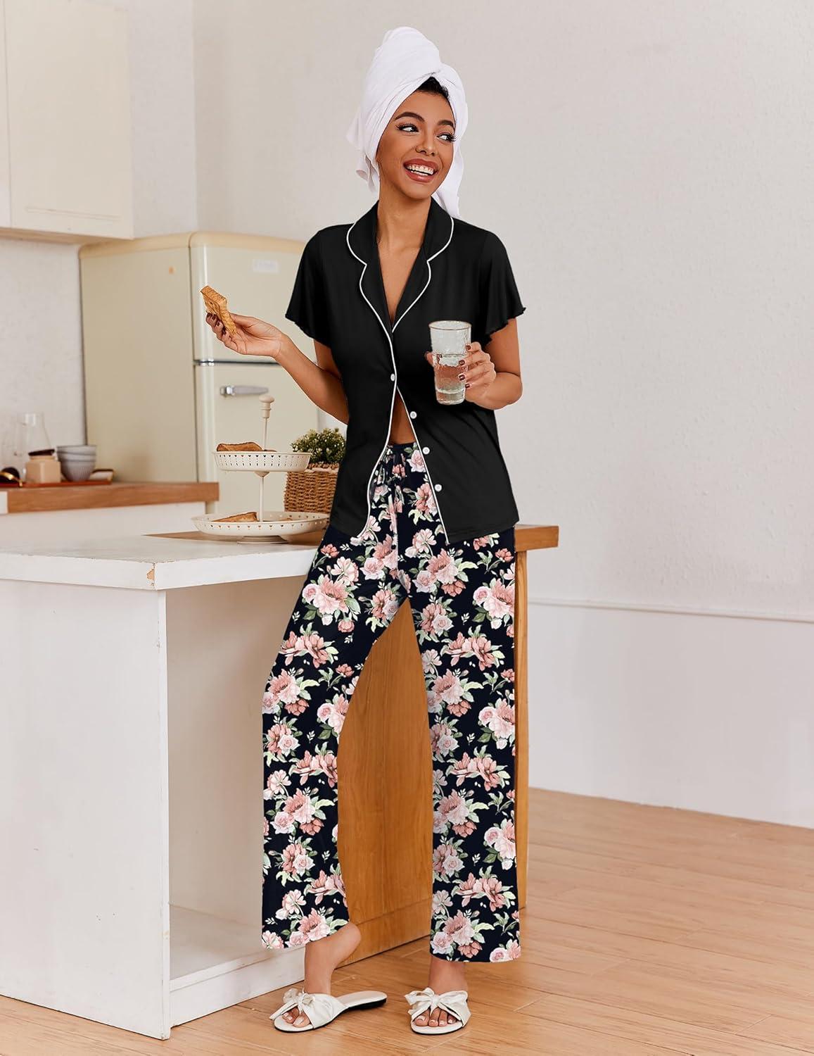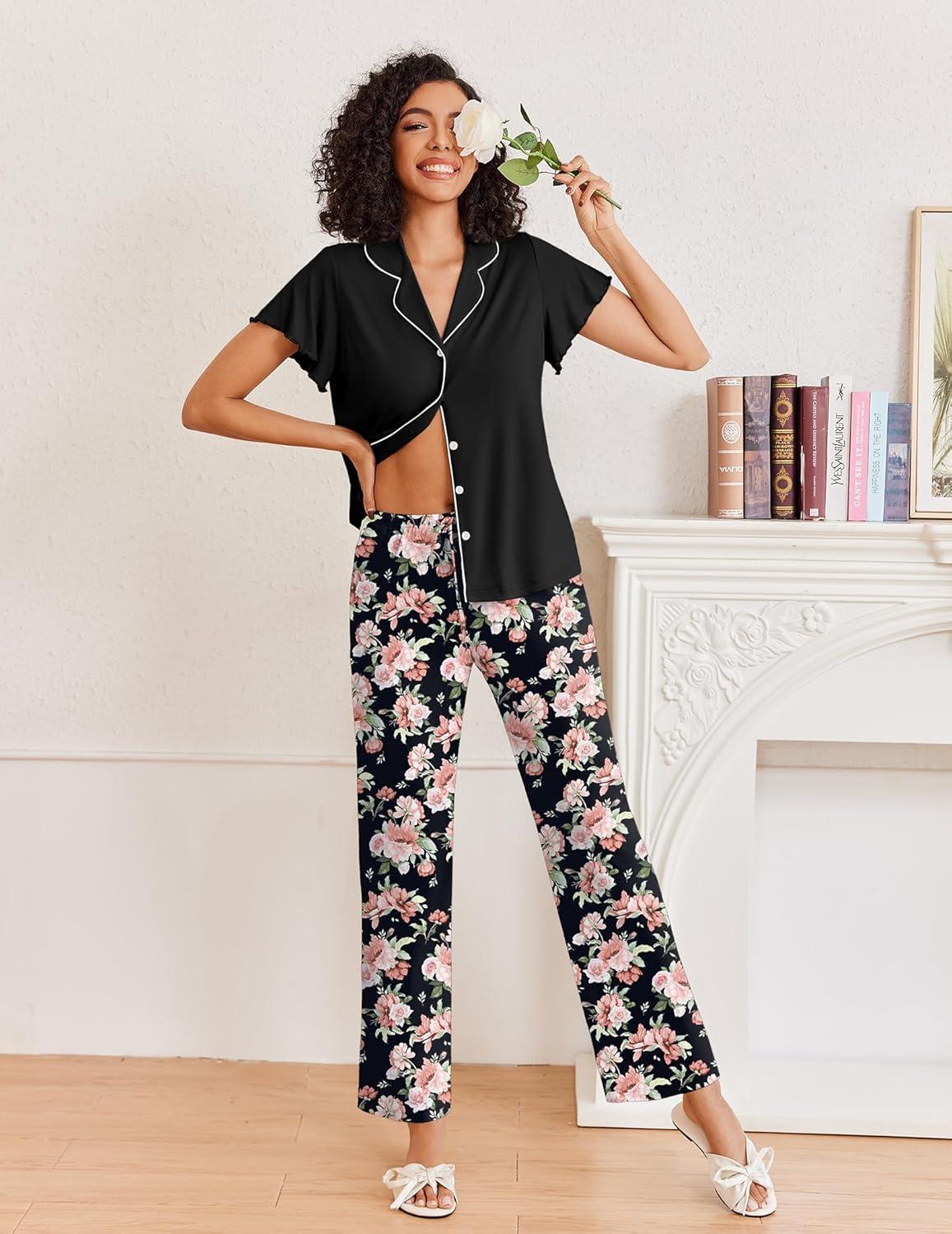 Ekouaer Pajamas for Women Set Button Up Sleepwear Cute Pjs Ruffle Sleeve Notch Collar Loungewear with Long Pants S-XXL(Black Floral)