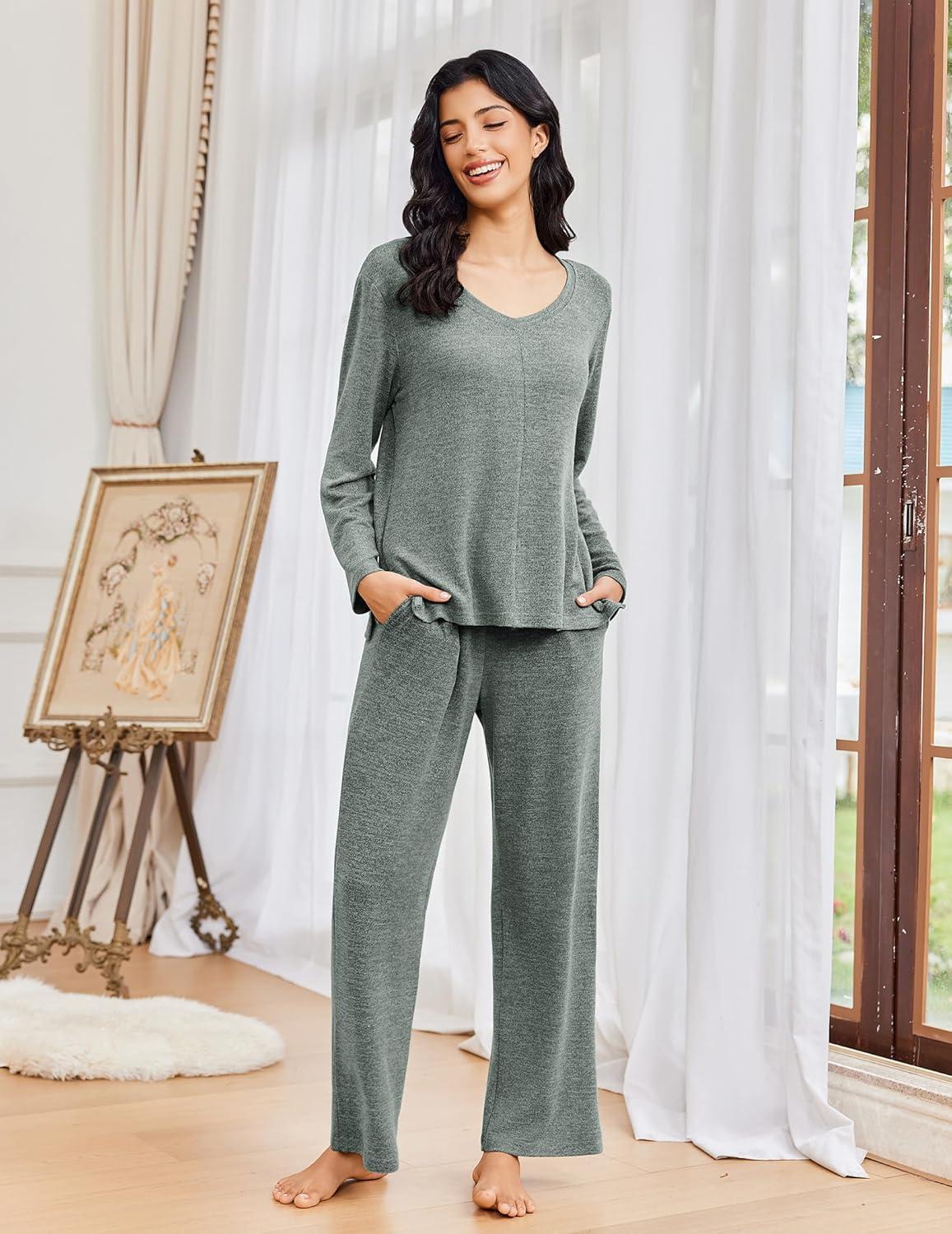 Ekouaer Pajamas for Women Set Long Sleeve 2 Piece Lounge Sets V Neck Matching Pjs Soft Sleepwear Fall Winter S-XXL(Army Green)