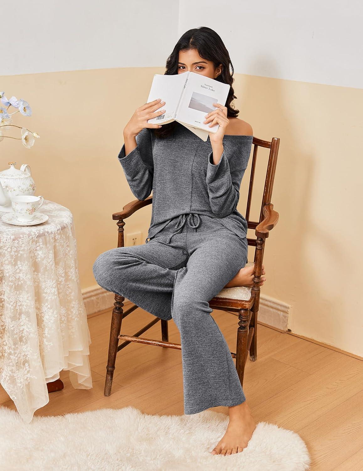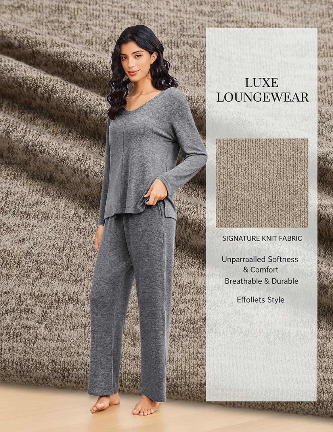 Ekouaer Pajamas for Women Set Long Sleeve 2 Piece Lounge Sets V Neck Matching Pjs Soft Sleepwear Fall Winter S-XXL(Grey)