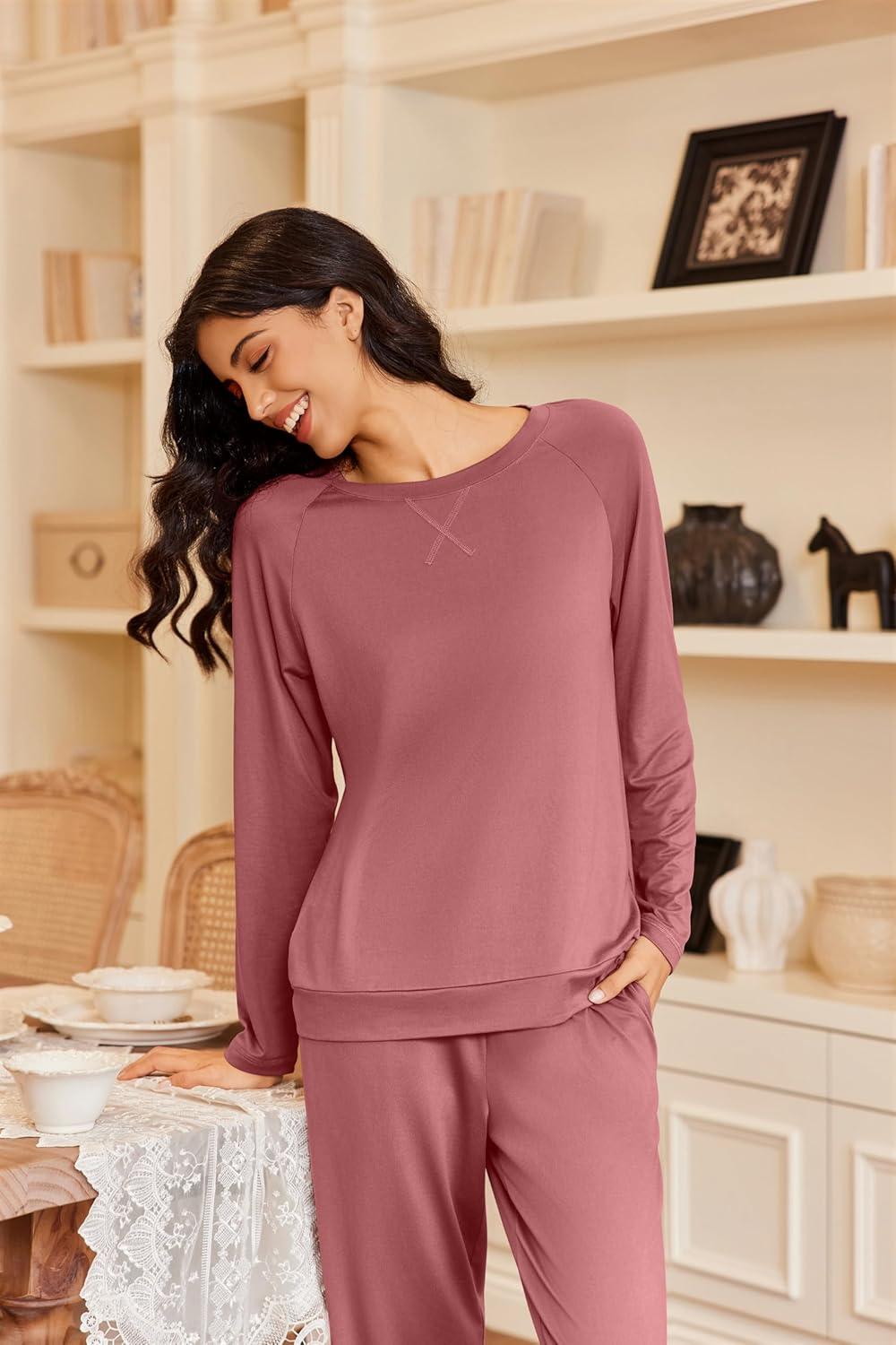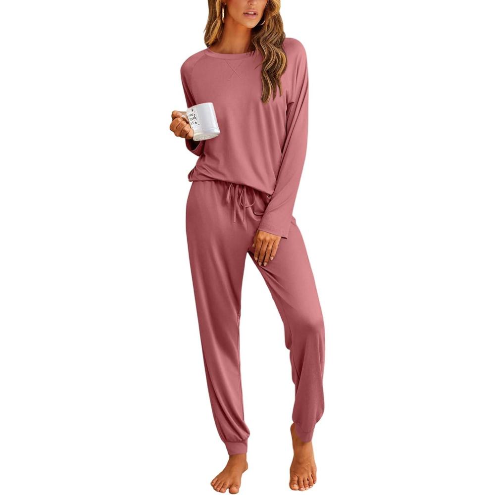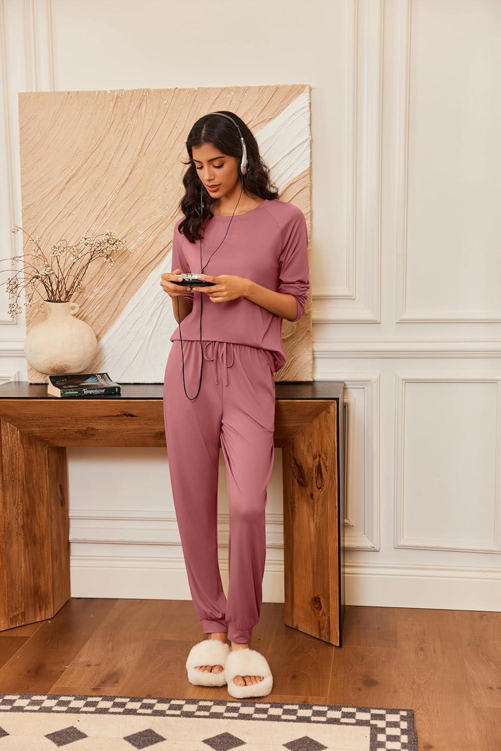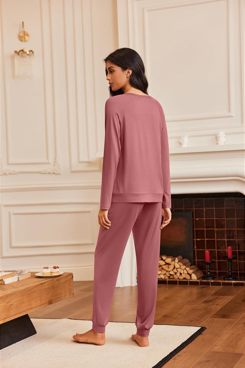 Ekouaer Pajamas Womens Long Sleeve Pj Set 2 Piece Loungewear Soft Comfy Sleepwear with Jogger Pants S-XXL(Old Rose)