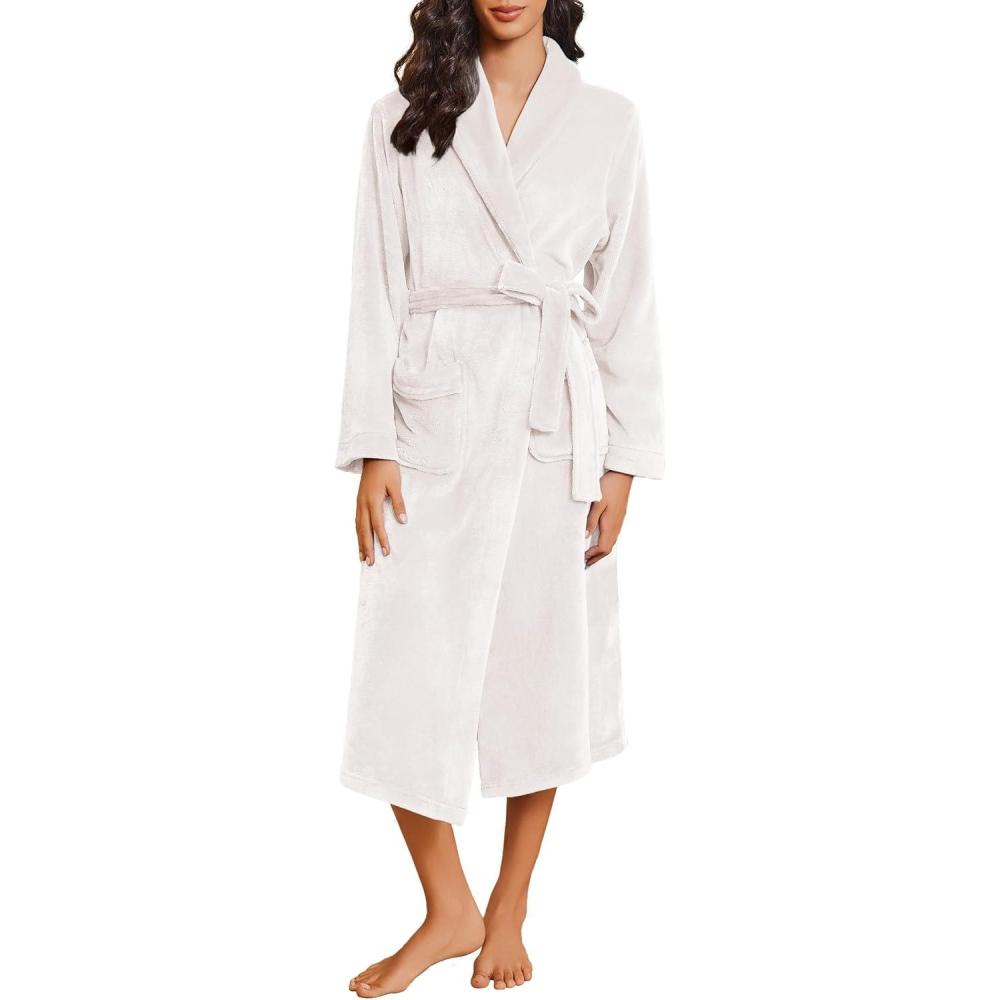 Ekouaer Robes for Women Soft Long Bathrobe Lightweight Fleece Shawl Collar Spa Robe Cozy Sleepwear with Pockets S-XXL(White)