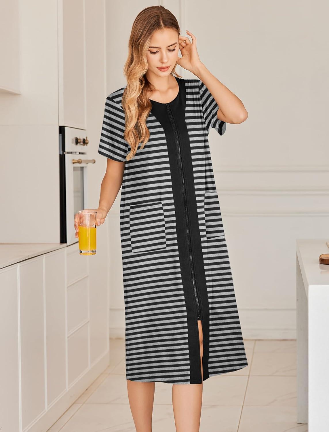 imageEkouaer Robes For Women Zipper Front Bathrobe Short Sleeve House Coat Long Nightgown With Pockets Soft LoungewearPat10