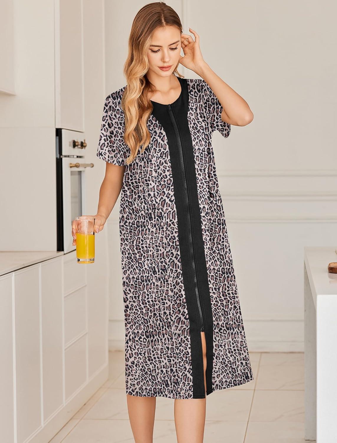 Ekouaer Robes For Women Zipper Front Bathrobe Short Sleeve House Coat Long Nightgown With Pockets Soft Loungewear(Leopard Print)