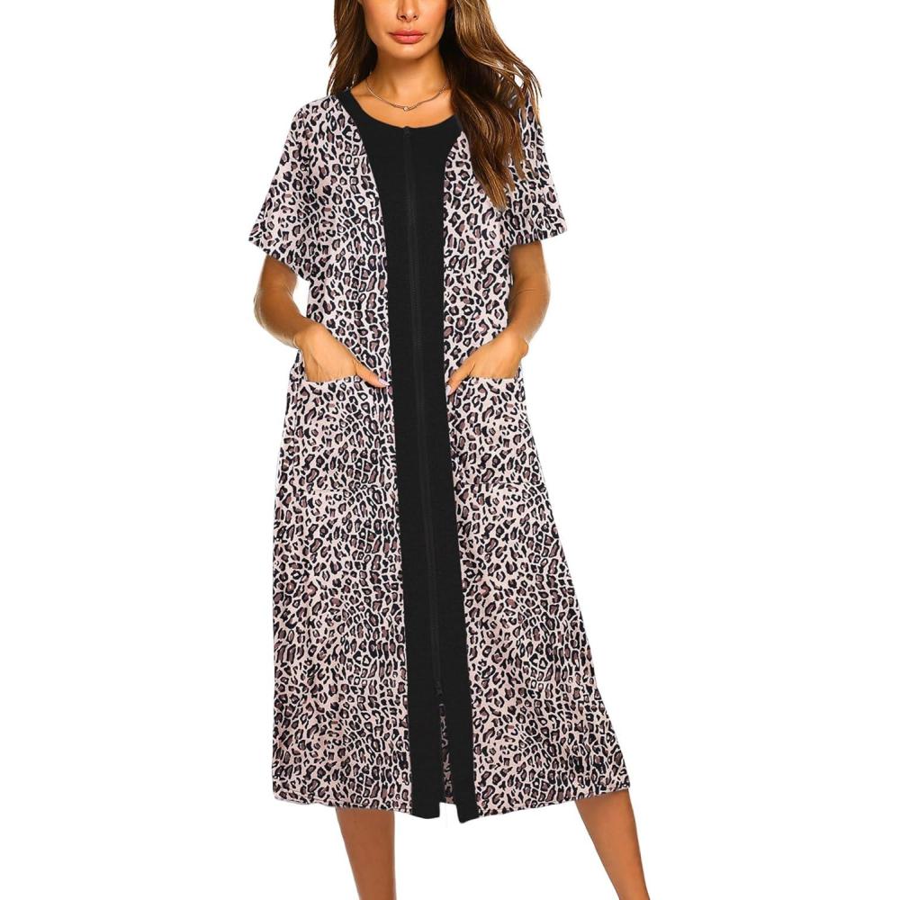 imageEkouaer Robes For Women Zipper Front Bathrobe Short Sleeve House Coat Long Nightgown With Pockets Soft LoungewearLeopard Print