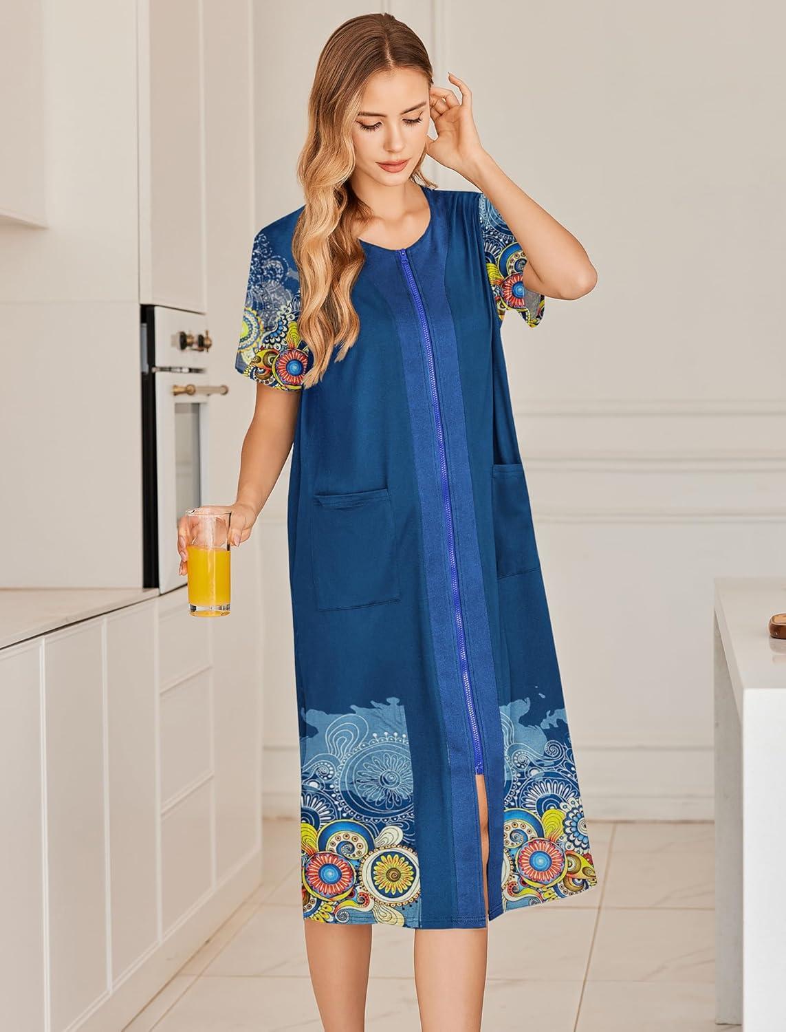 Ekouaer Robes For Women Zipper Front Bathrobe Short Sleeve House Coat Long Nightgown With Pockets Soft Loungewear(Pat6)
