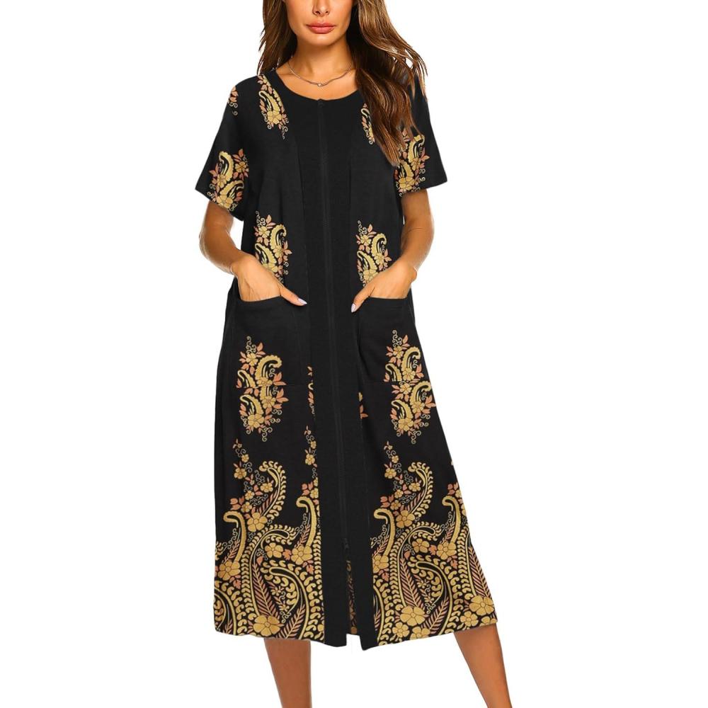 Ekouaer Robes For Women Zipper Front Bathrobe Short Sleeve House Coat Long Nightgown With Pockets Soft Loungewear(Pat12)