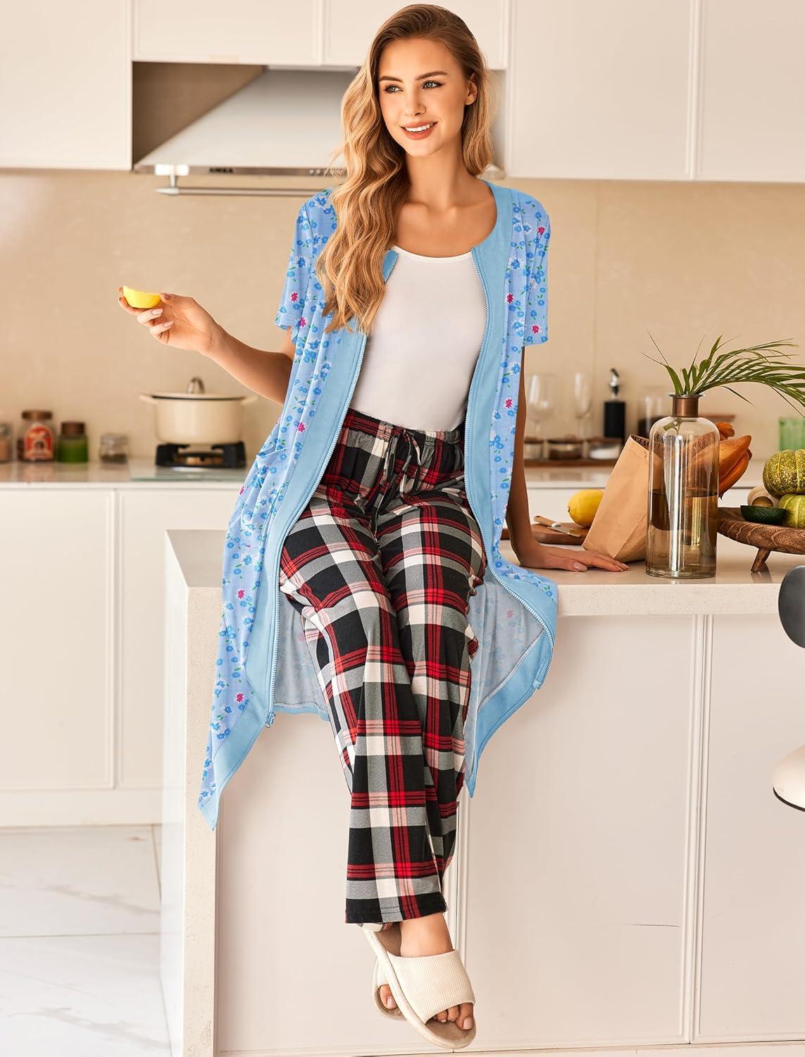 Ekouaer Robes For Women Zipper Front Bathrobe Short Sleeve House Coat Long Nightgown With Pockets Soft Loungewear(Pat13)
