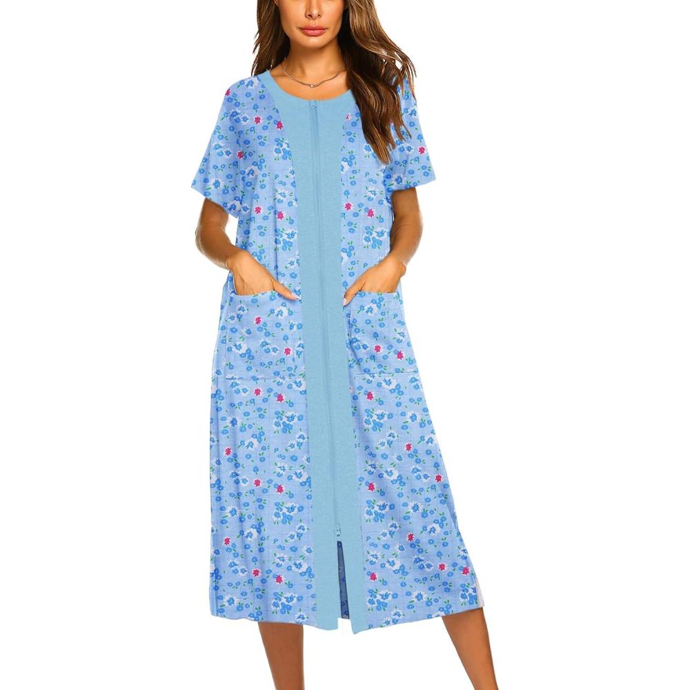 imageEkouaer Robes For Women Zipper Front Bathrobe Short Sleeve House Coat Long Nightgown With Pockets Soft LoungewearPat13