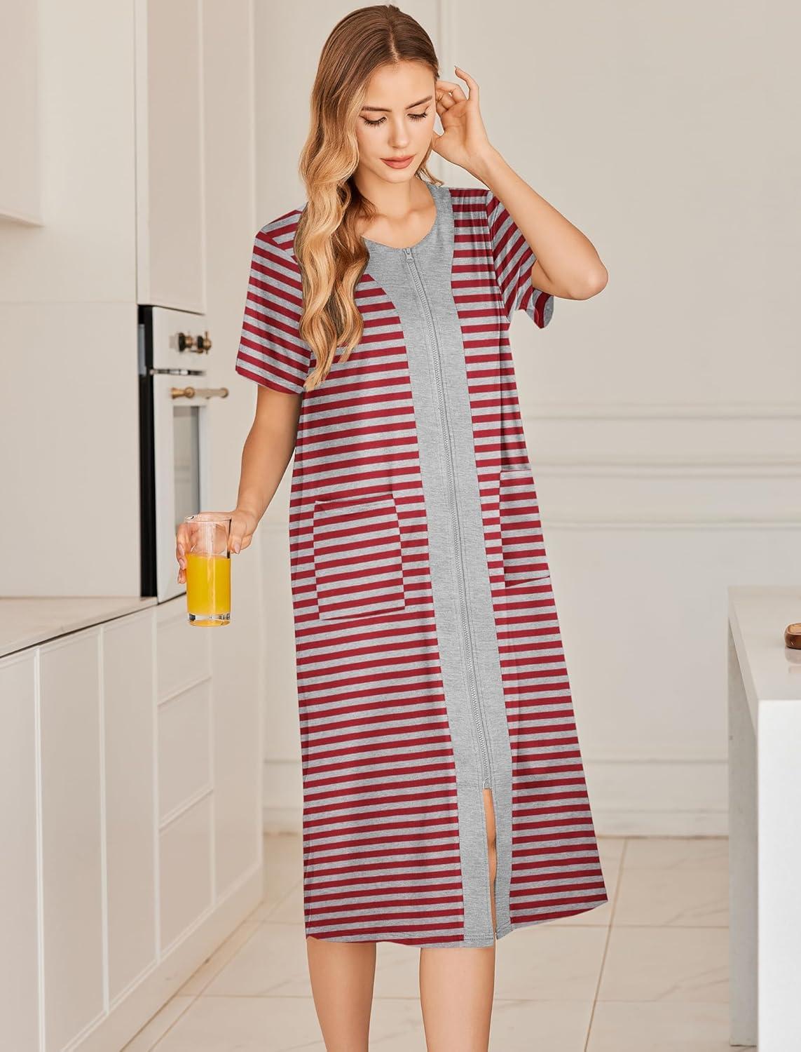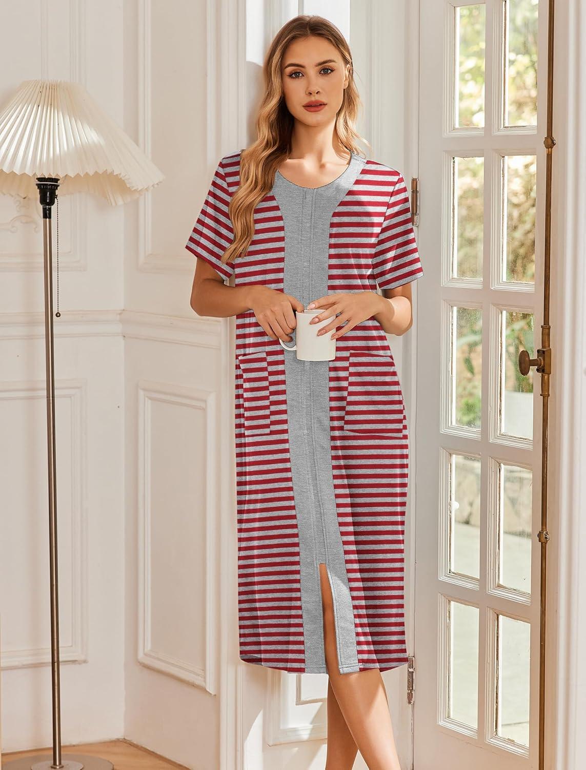 imageEkouaer Robes For Women Zipper Front Bathrobe Short Sleeve House Coat Long Nightgown With Pockets Soft LoungewearRed