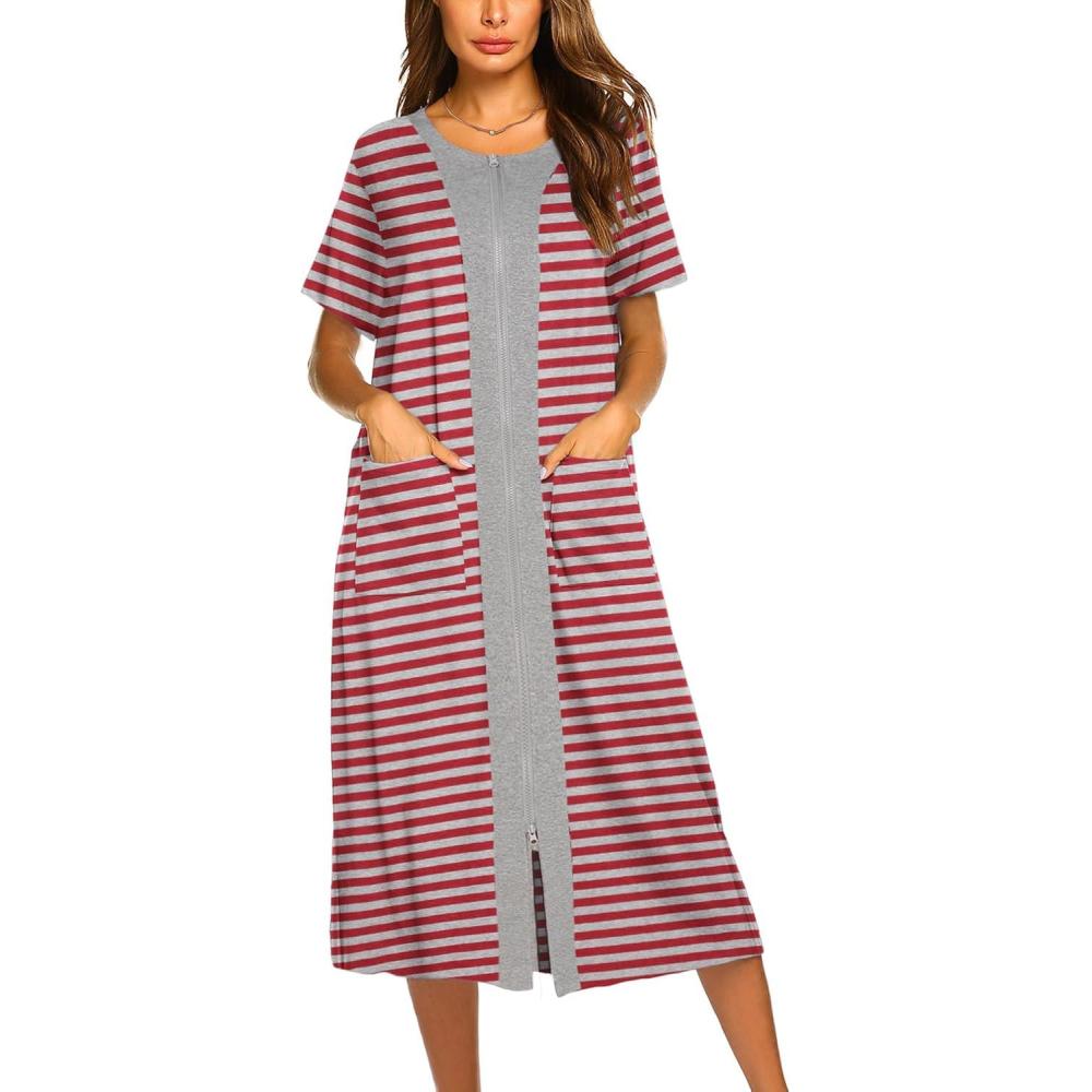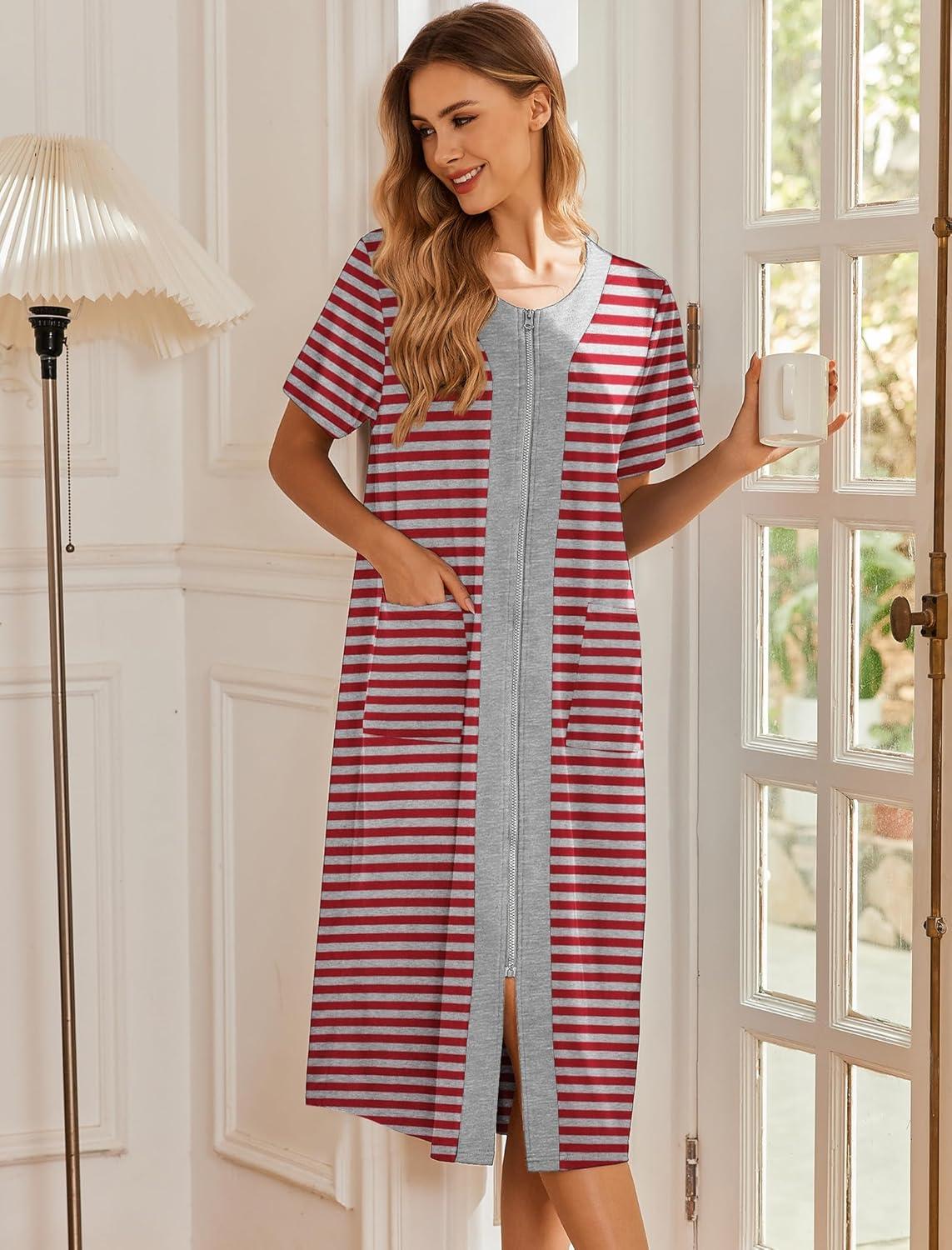 imageEkouaer Robes For Women Zipper Front Bathrobe Short Sleeve House Coat Long Nightgown With Pockets Soft LoungewearBlackred