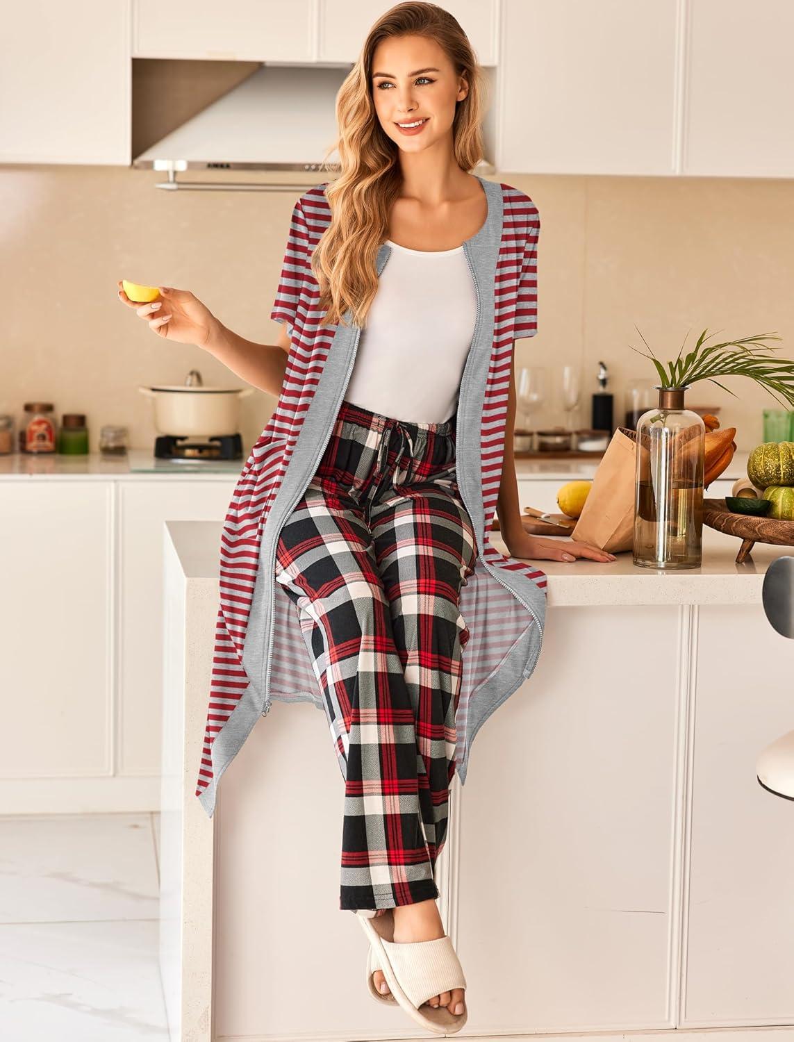 Ekouaer Robes For Women Zipper Front Bathrobe Short Sleeve House Coat Long Nightgown With Pockets Soft Loungewear(Black&red)