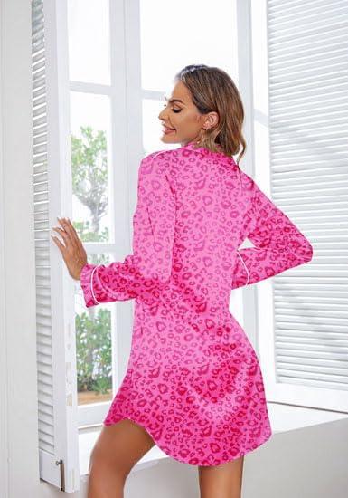 Ekouaer Satin Nightgowns for Women Button Down Sleep Shirt Silk Night Shirt Long Sleeve Boyfriend Sleepwear S-3XL(Pink Leopard Print)