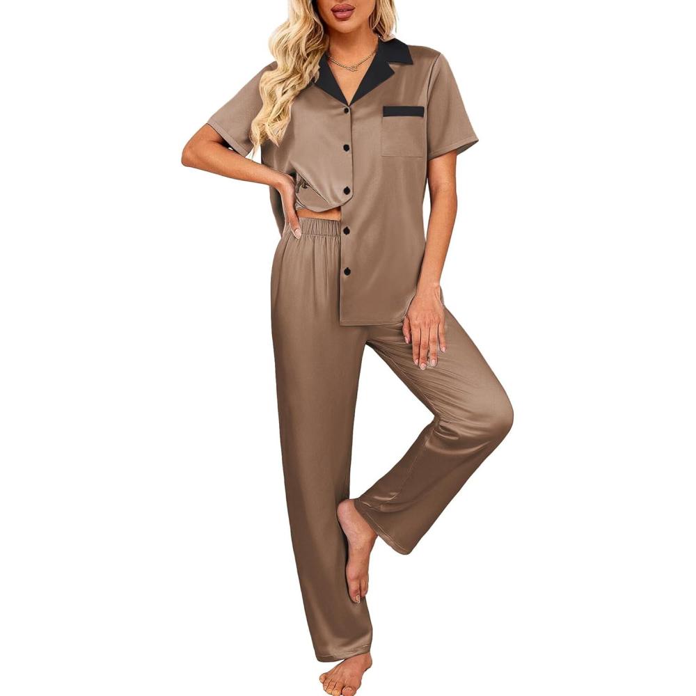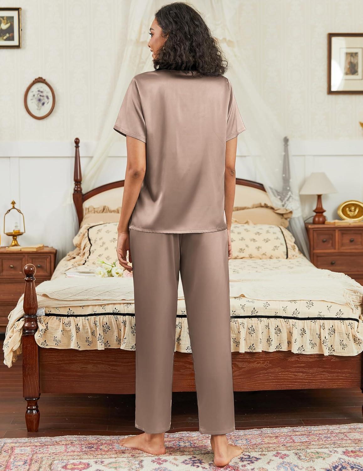 Ekouaer Satin Pajamas Set for Women Silk Button Down Sleepwear Short Sleeve Loungewear 2 Pieces Nightwear(Brown)