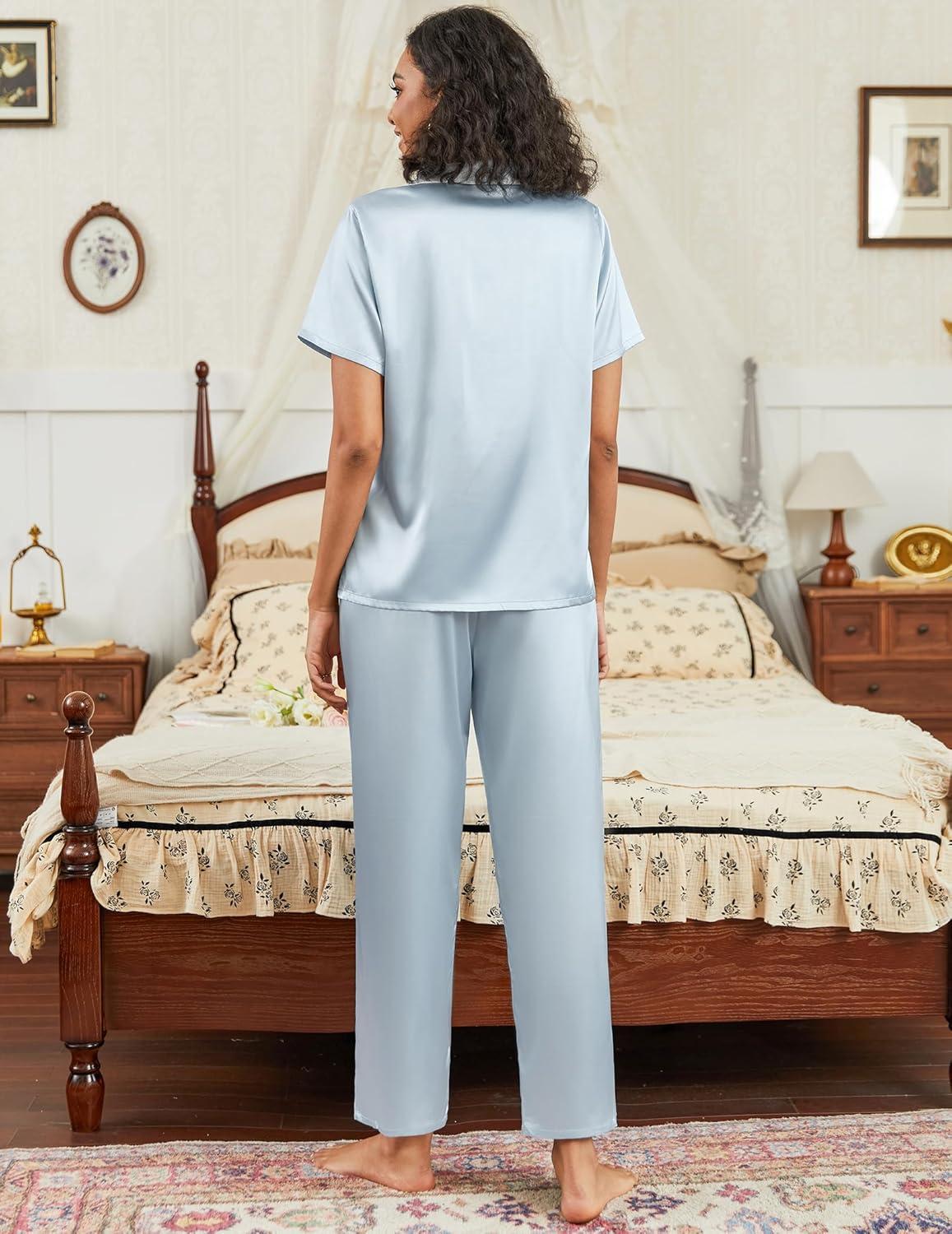 Ekouaer Satin Pajamas Set for Women Silk Button Down Sleepwear Short Sleeve Loungewear 2 Pieces Nightwear(Clear Blue)