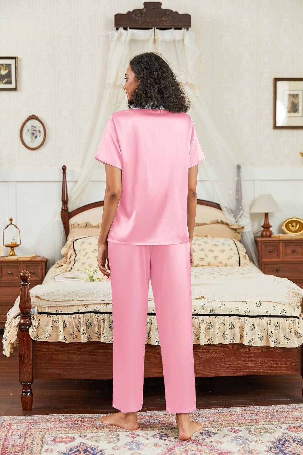 Ekouaer Satin Pajamas Set for Women Silk Button Down Sleepwear Short Sleeve Loungewear 2 Pieces Nightwear(Light Pink)