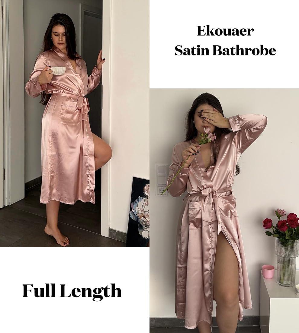 Ekouaer Satin Robes for Women Long Sleeve Silk Bathrobe Soft Lightweight Full Length Sleepwear Bridesmaid Wedding Party Robes(Pink)