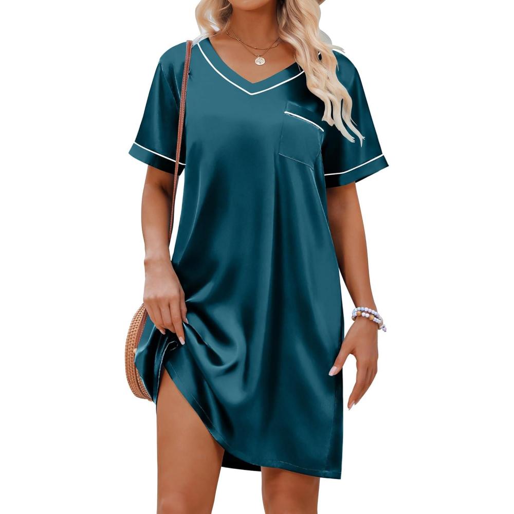 Ekouaer Satin Silk Nightgown for Women Silky Loose Sleepwear V Neck Nightshirt Short Sleeve Sleep Dress(Blue Green)