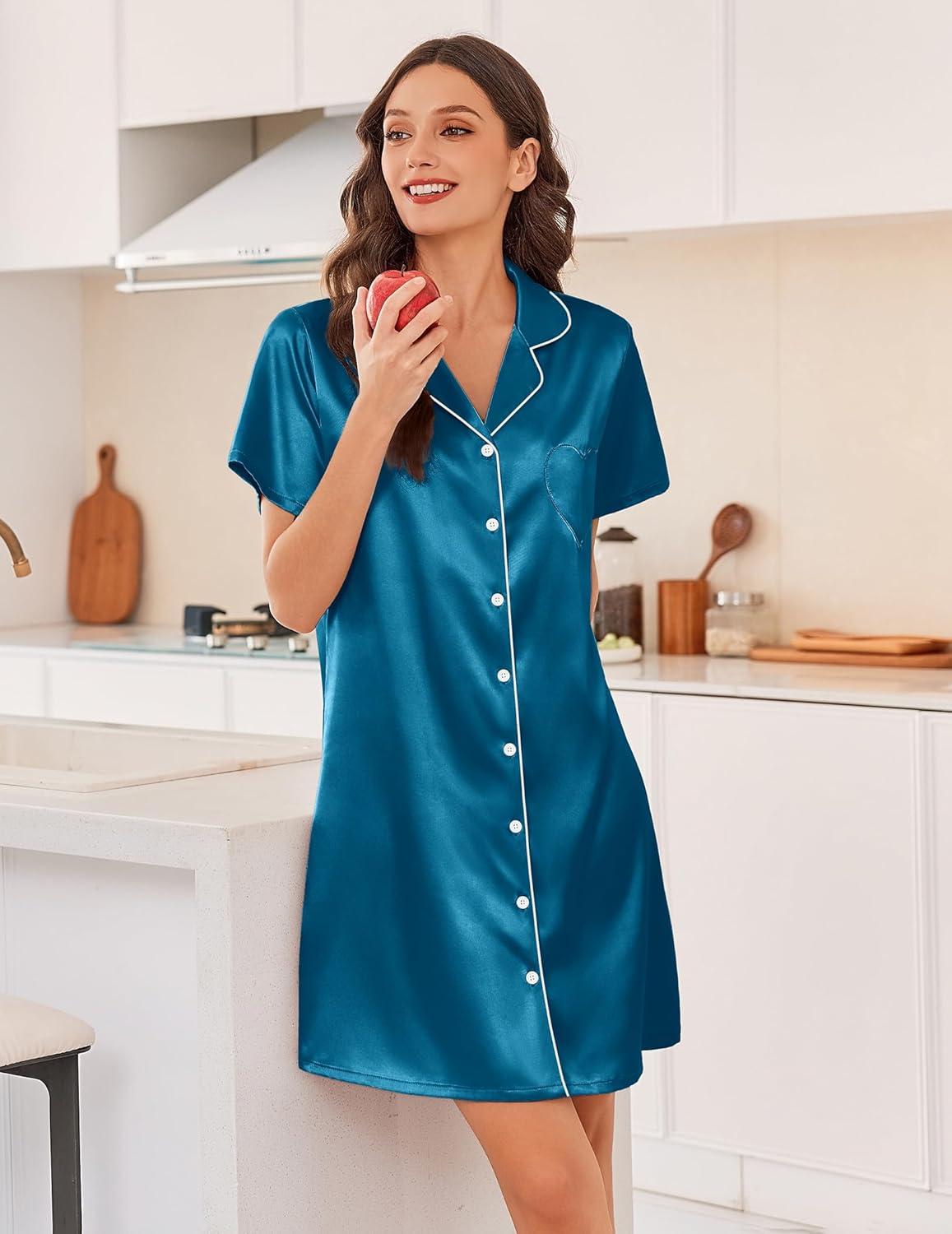 Ekouaer Silk Nightgowns for Women Button Down Nightshirts Short Sleeve Sleepshirts Sexy Nightdress Satin Sleepwear(Deep Blue)