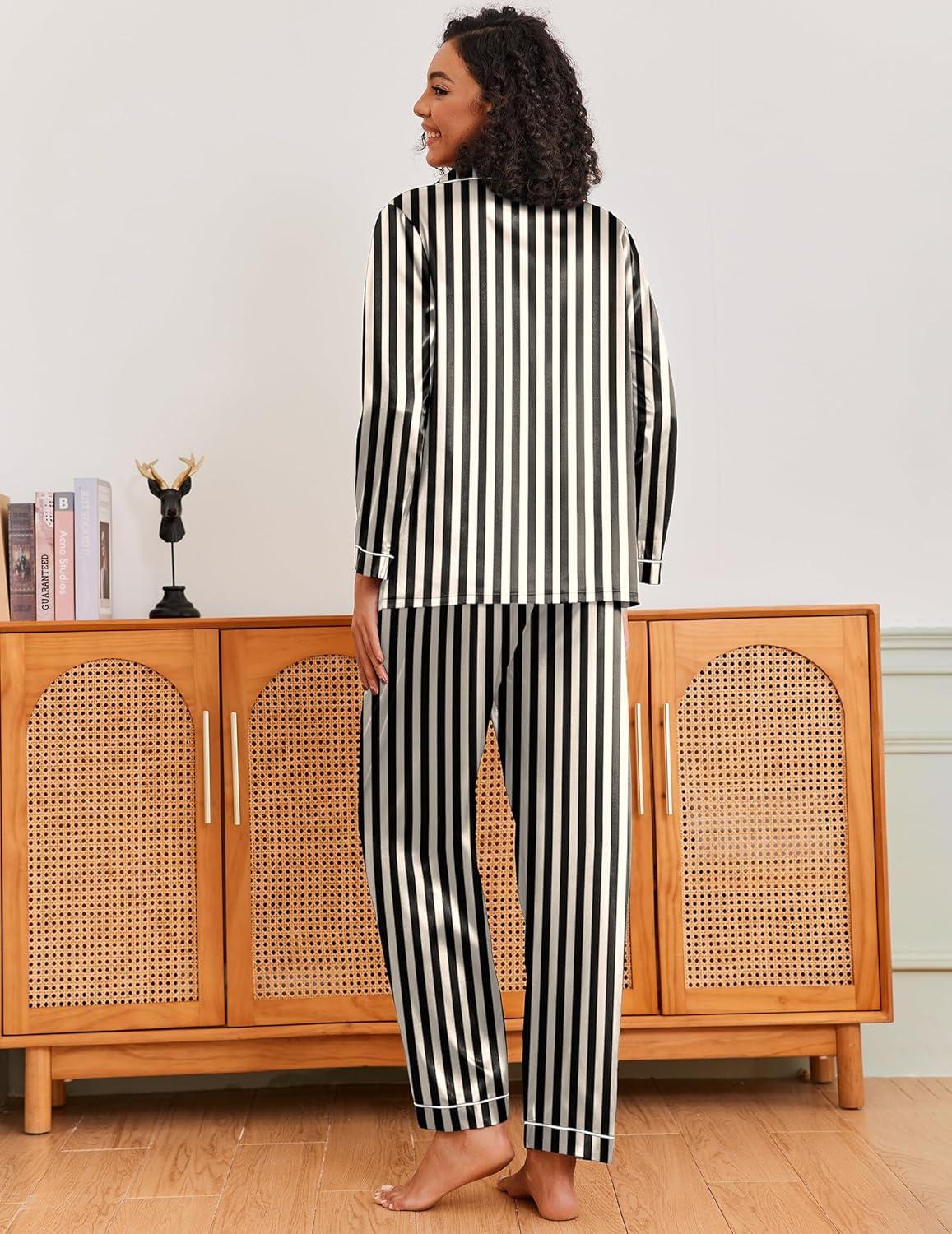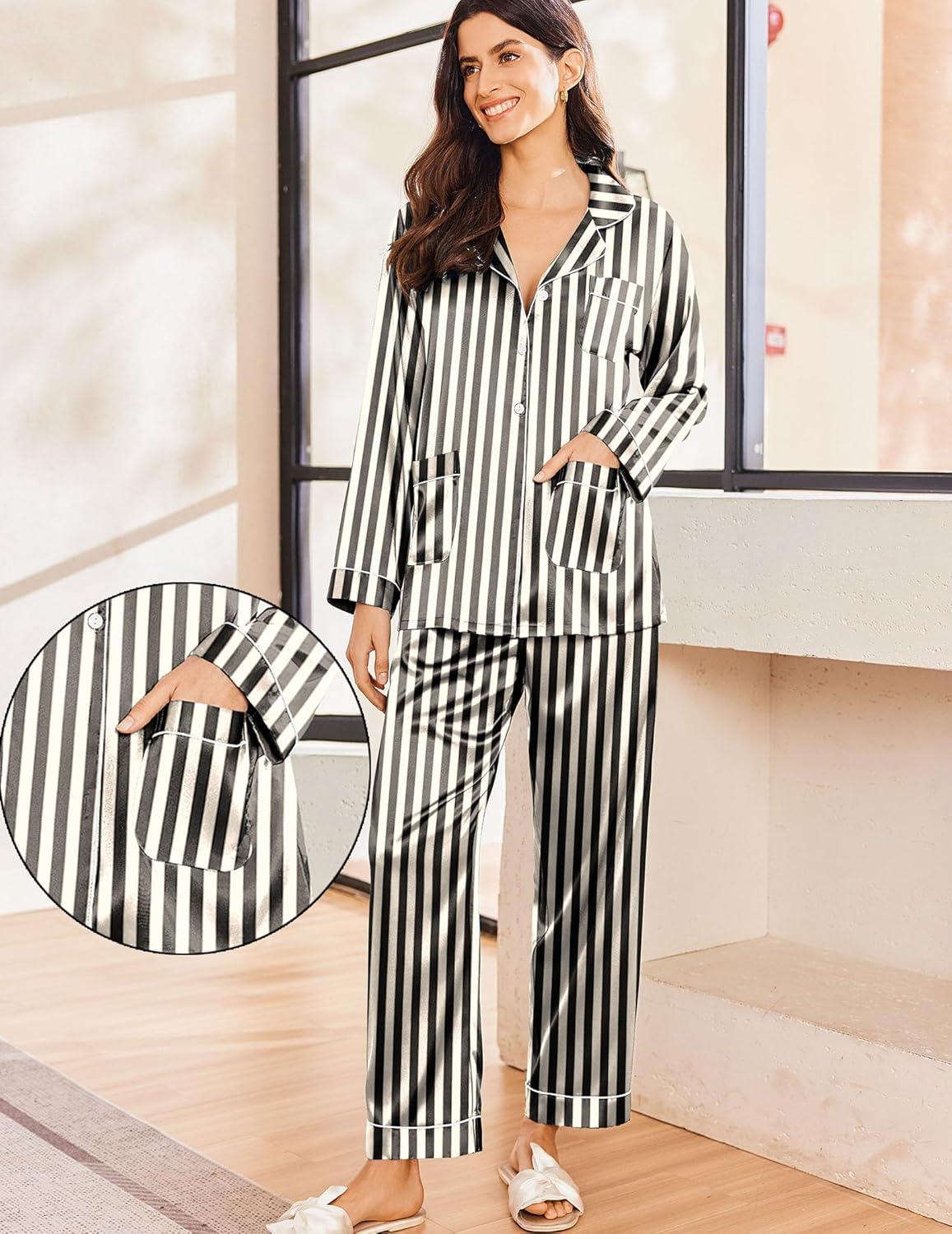 Ekouaer Silk Pajamas for Women Classic Button Down Satin Pajama Sets Long Sleeve Lounge Set(Black Champagne Stripe)