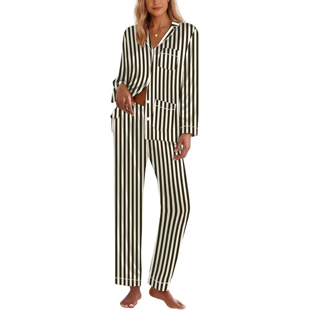 Ekouaer Silk Pajamas for Women Classic Button Down Satin Pajama Sets Long Sleeve Lounge Set(Black Brown Stripe)