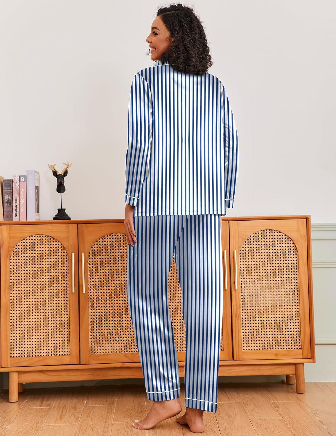 Ekouaer Silk Pajamas for Women Classic Button Down Satin Pajama Sets Long Sleeve Lounge Set(Blue White Stripe)