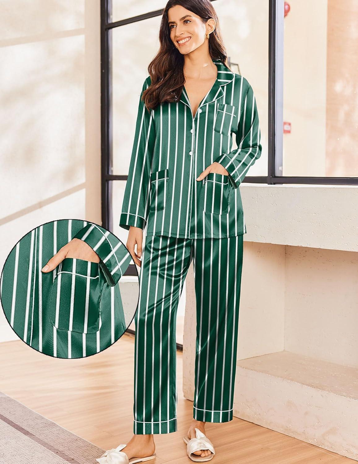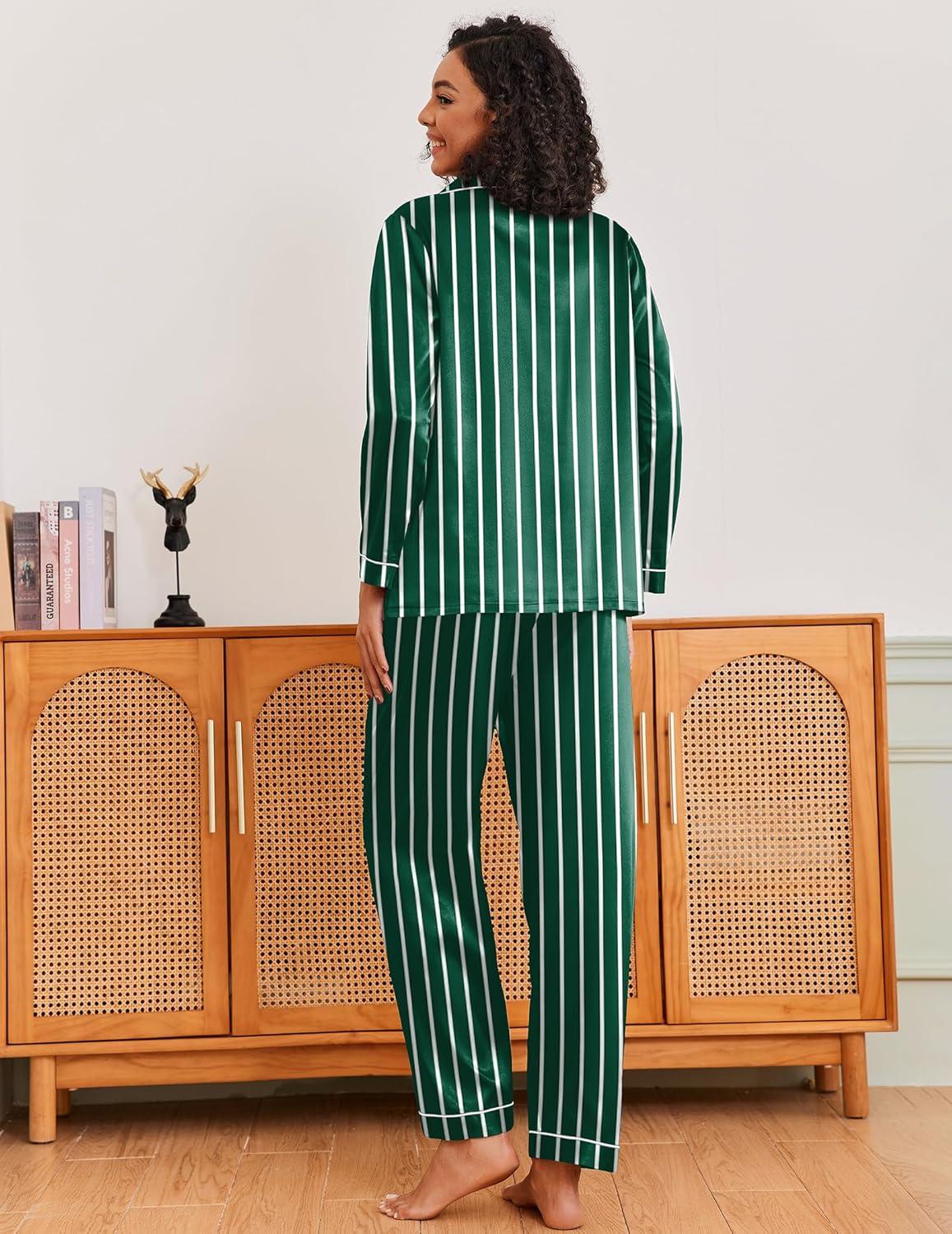 Ekouaer Silk Pajamas for Women Classic Button Down Satin Pajama Sets Long Sleeve Lounge Set(Dark Green Striped)