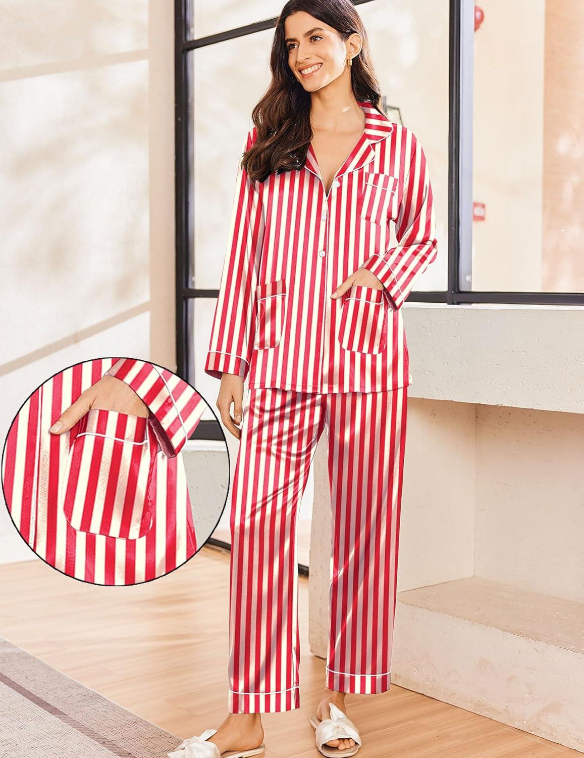 Ekouaer Silk Pajamas for Women Classic Button Down Satin Pajama Sets Long Sleeve Lounge Set(Red White Stripe)