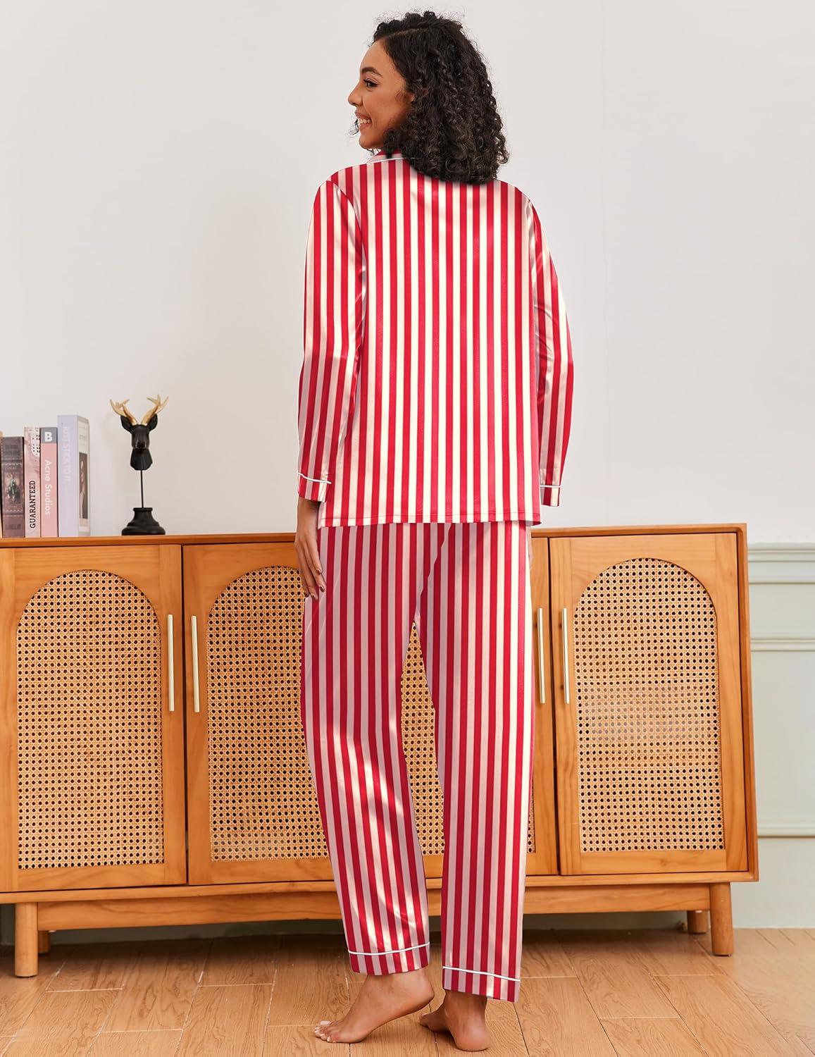 imageEkouaer Silk Pajamas for Women Classic Button Down Satin Pajama Sets Long Sleeve Lounge SetRed White Stripe