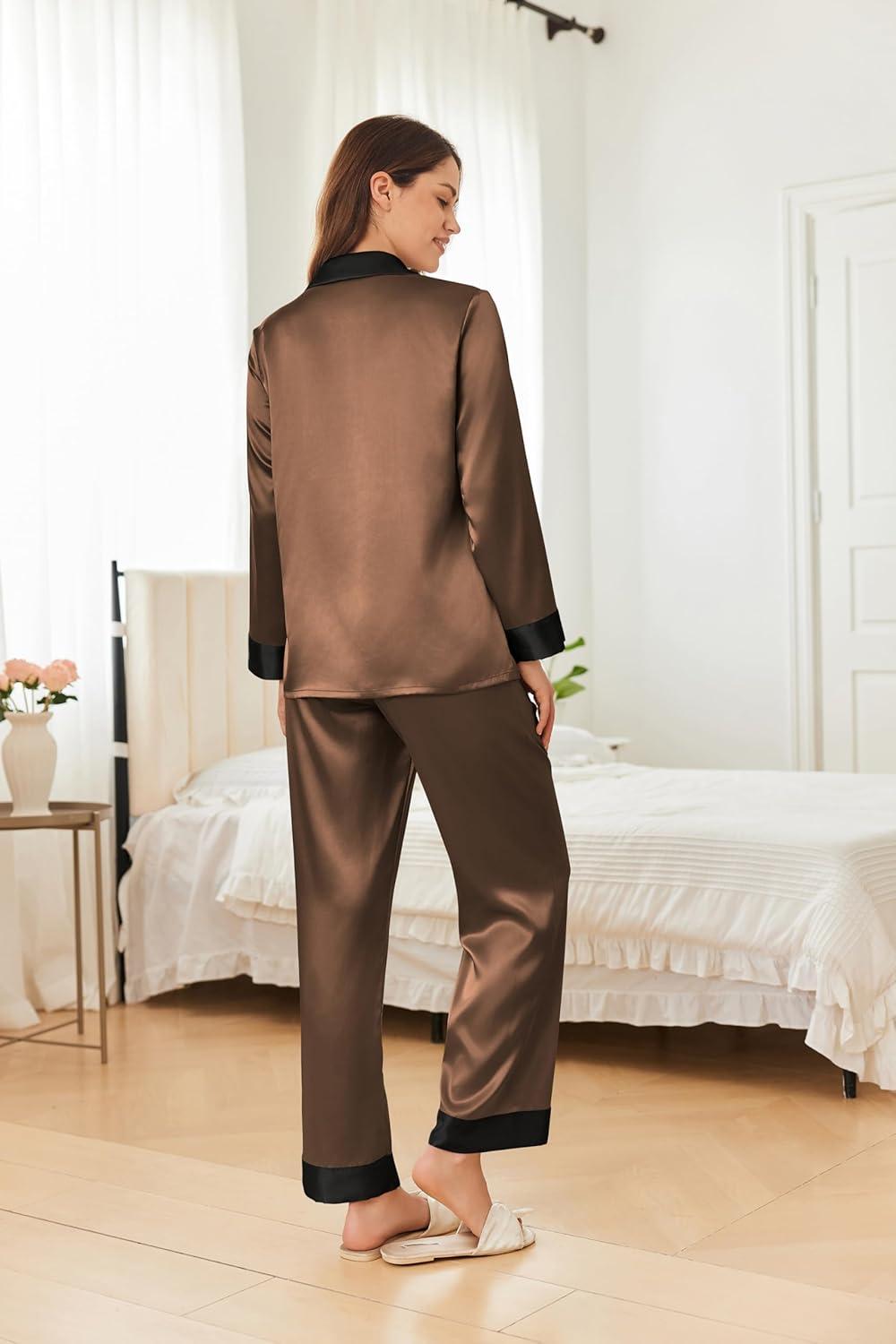 Ekouaer Silk Pajamas for Women Long Sleeve Satin Pajama Set Striped Leopard Print Pj Sets Button Down Loungewear Sleepwear(Brown)