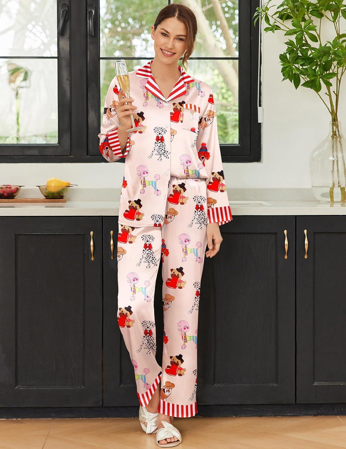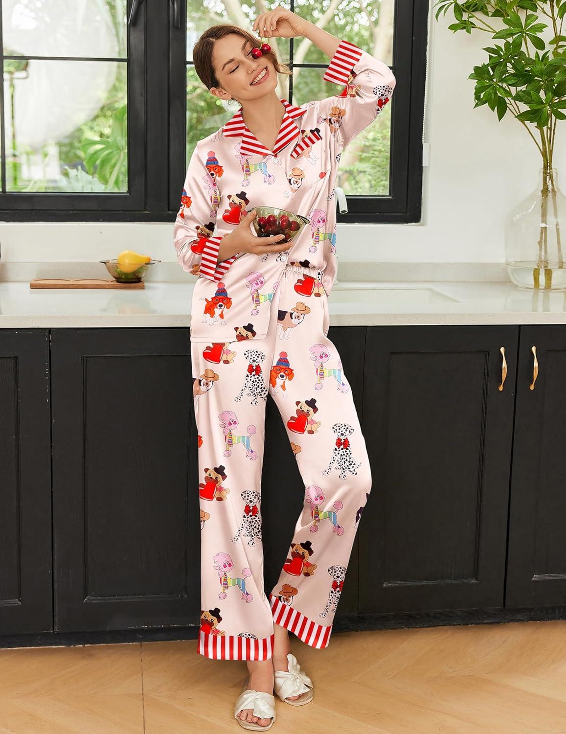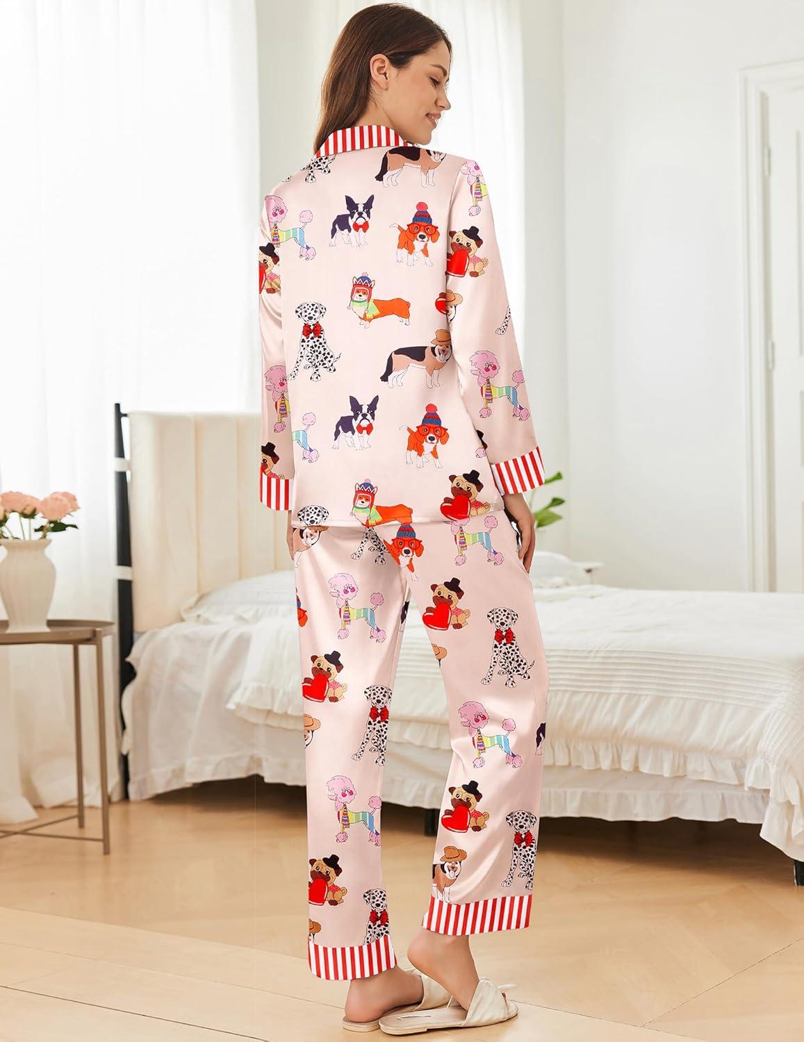 Ekouaer Silk Pajamas for Women Long Sleeve Satin Pajama Set Striped Leopard Print Pj Sets Button Down Loungewear Sleepwear(Different Cute Dogs)