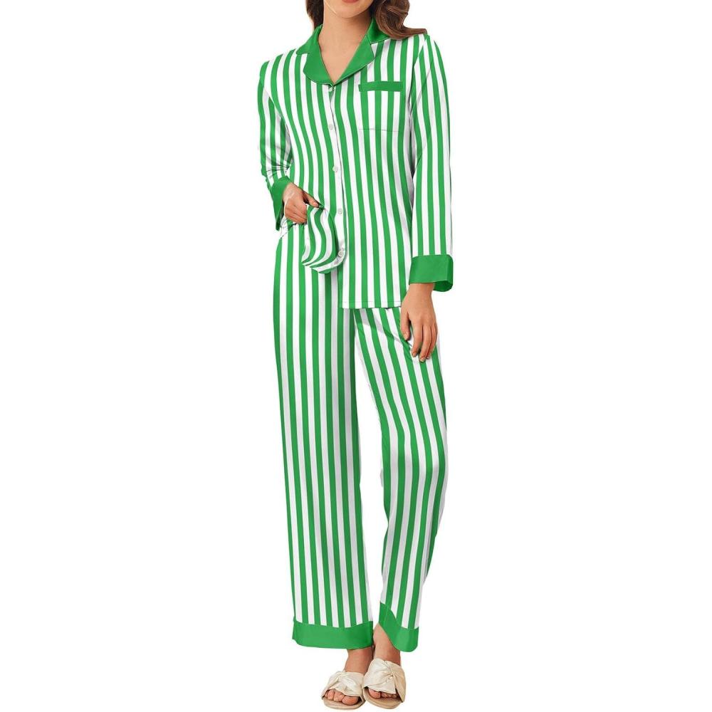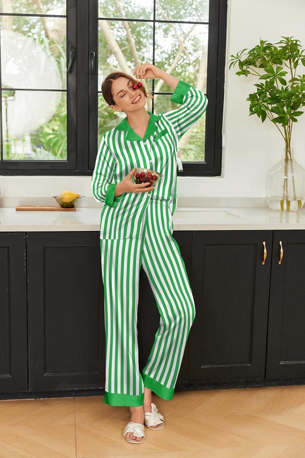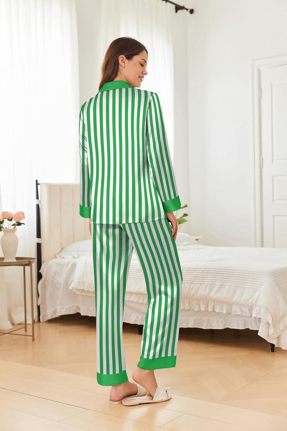 Ekouaer Silk Pajamas for Women Long Sleeve Satin Pajama Set Striped Leopard Print Pj Sets Button Down Loungewear Sleepwear(Green Stripes)