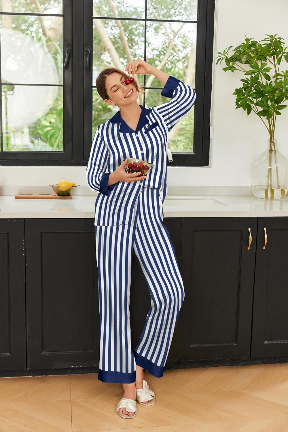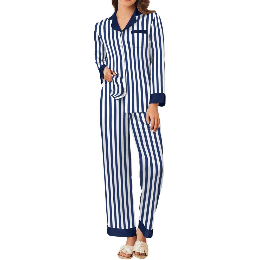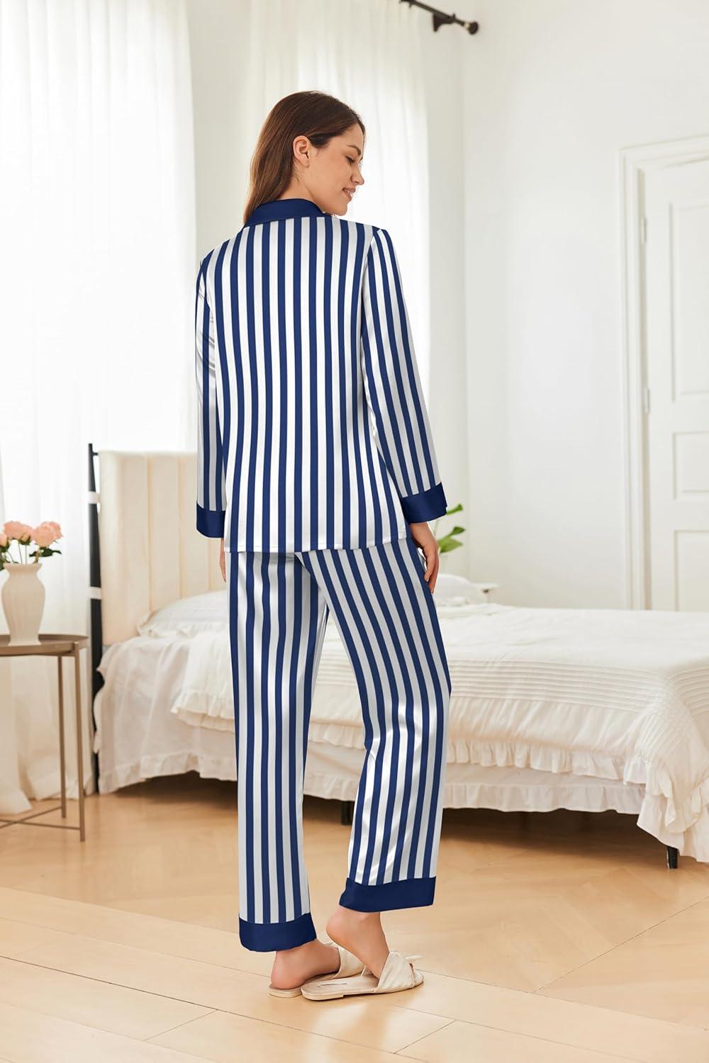 Ekouaer Silk Pajamas for Women Long Sleeve Satin Pajama Set Striped Leopard Print Pj Sets Button Down Loungewear Sleepwear(Navy Blue Stripes)