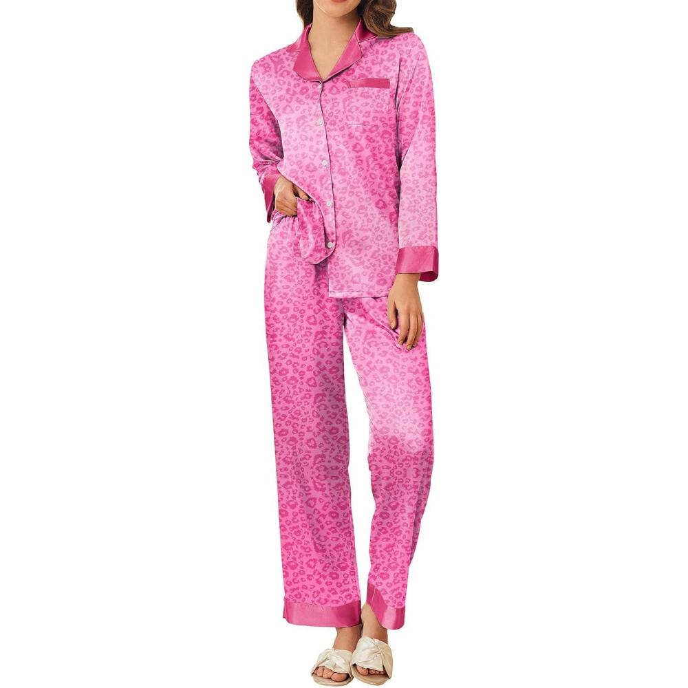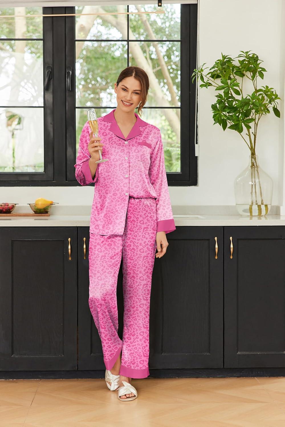 Ekouaer Silk Pajamas for Women Long Sleeve Satin Pajama Set Striped Leopard Print Pj Sets Button Down Loungewear Sleepwear(Pink Leopard)