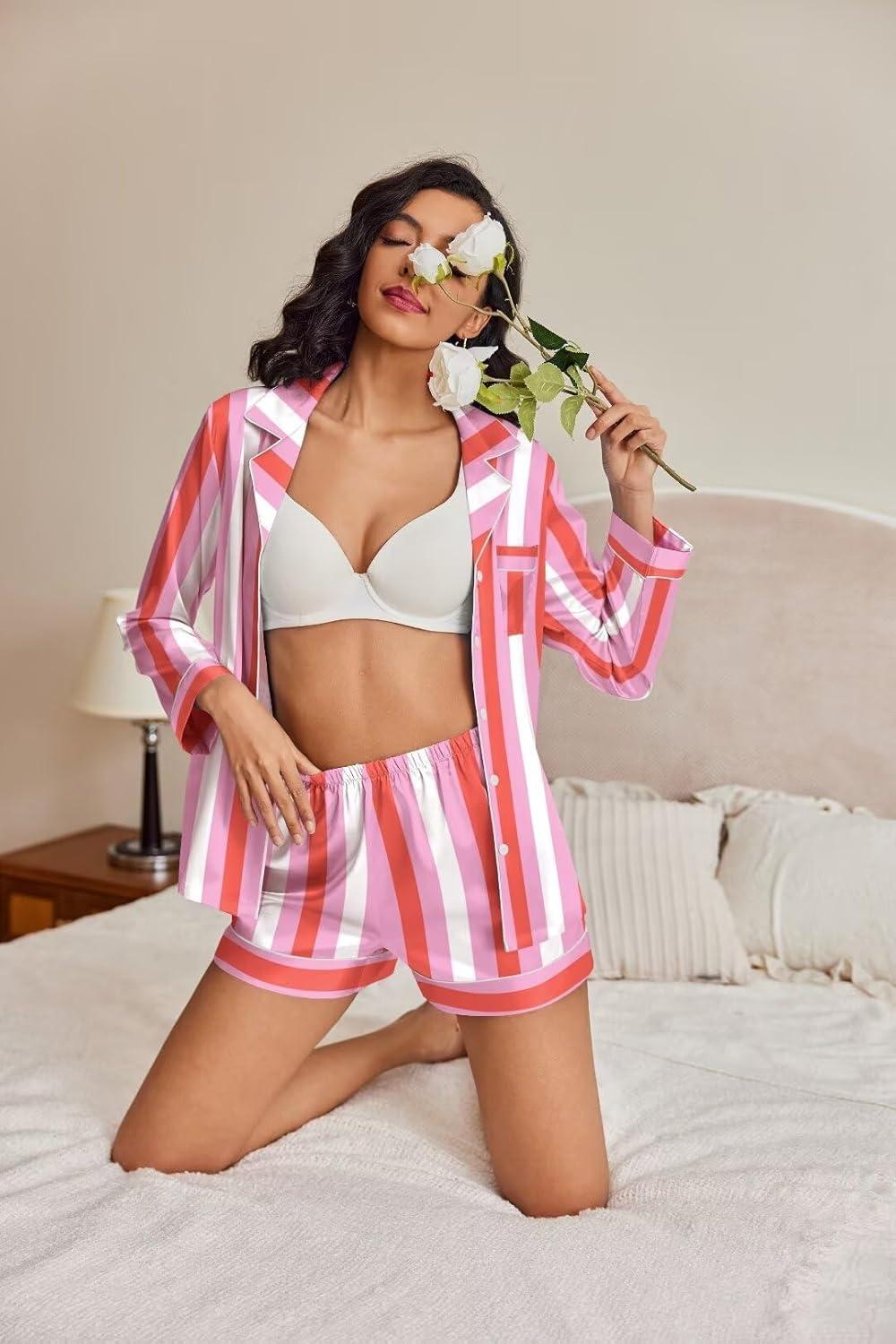 Ekouaer Silk Pajamas for Women Satin Pajama Set Shorts and Top Long Sleeve Silky PJ Soft Loungewear Sleepwear Button Down(Vertical Stripes-pink)