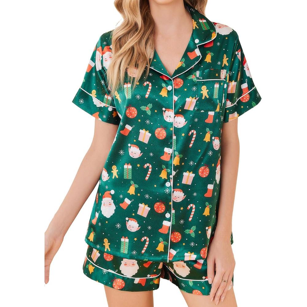 imageEkouaer Silk Pajamas for Women Short Sleeve Sleepwear Soft Button Down Loungewear 2 Piece Satin Pjs Shorts Set SXXLChristmas Green
