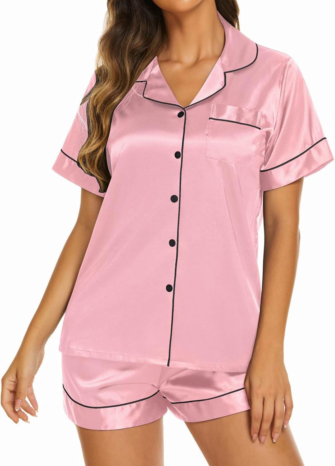 Ekouaer Silk Pajamas for Women Short Sleeve Sleepwear Soft Button Down Loungewear 2 Piece Satin Pjs Shorts Set S-XXL(Pink)